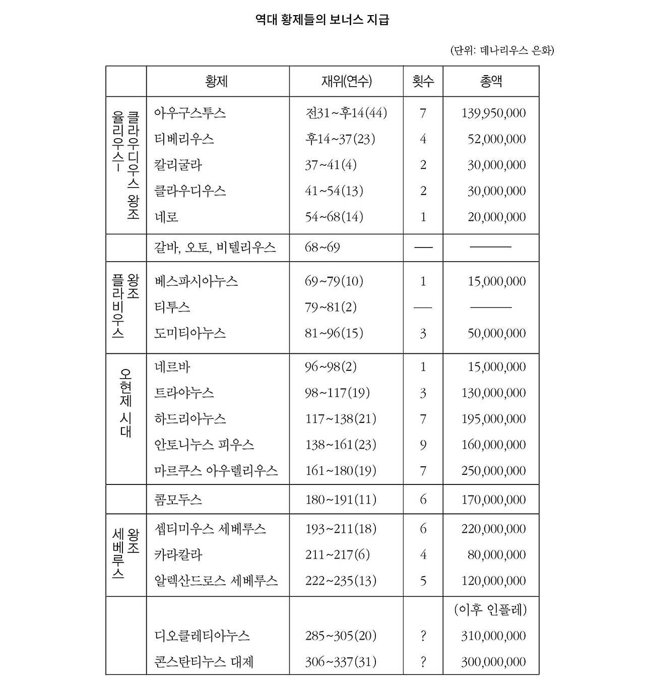 황제가 새로 즉위하거나 나라에 경사스러운 일이 생기면 수도의 평민이나 속주의 군단병들에게 보너스를 나누어주는 관습이 생겼다. 민심을 장악하기 위한 방책이었던 것은 말할 나위도 없다. 일인당 보너스는 군단병 연봉의 3분의 1 정도였다.