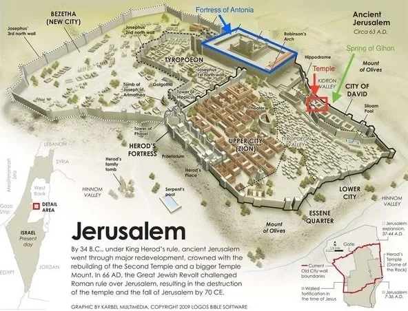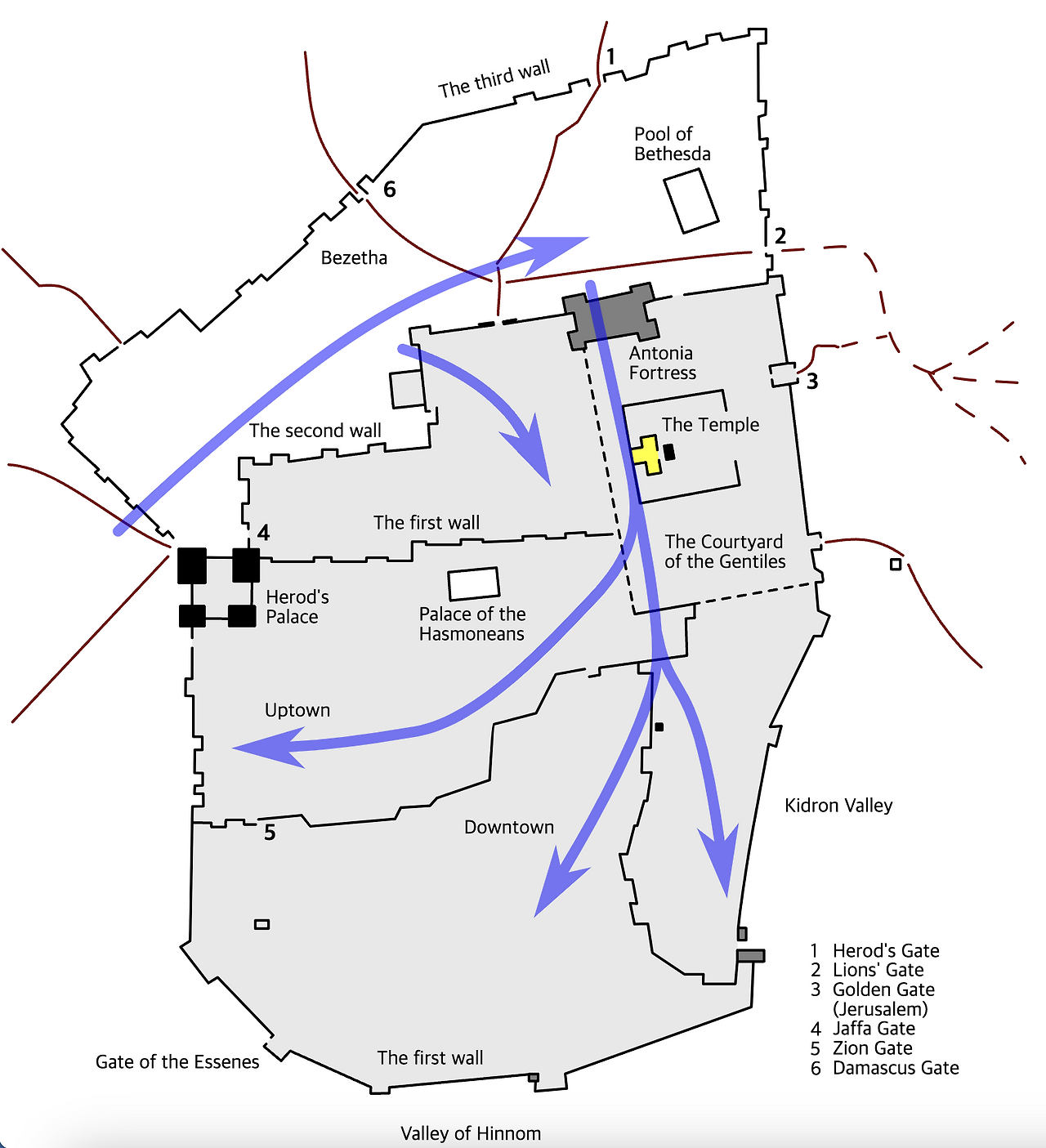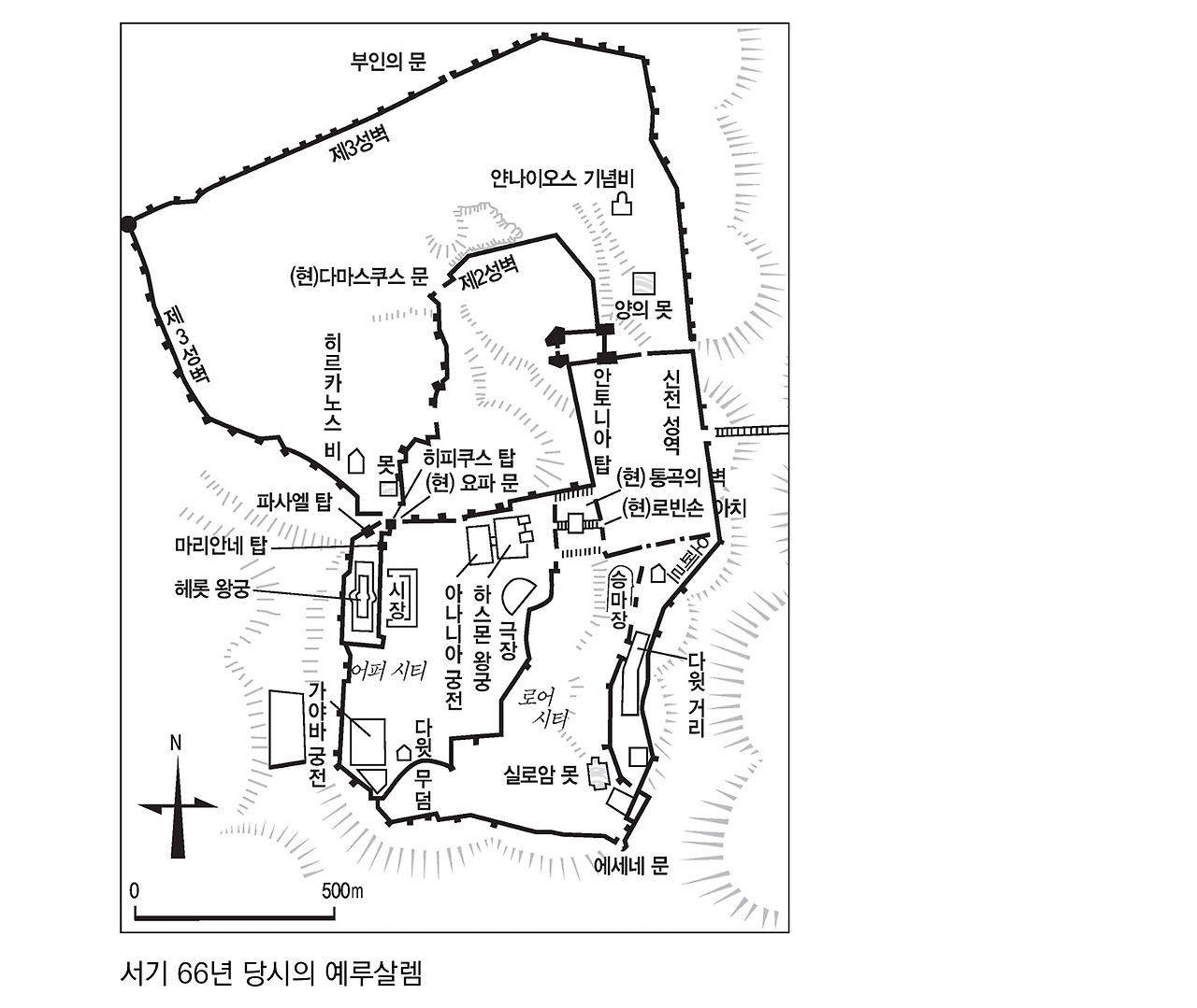 예루살렘은 사방을 둘러싼 높은 벼랑 위에 서 있는 천연 요새다. 이곳을 공략하려면 깊은 골짜기라는 장애물이 없는 북쪽에서 쳐들어갈 수밖에 없다. 요소요소에는 높은 탑과 튼튼한 돌벽으로 둘러싸인 성채가 우뚝 솟아 있다. 종교의 터전인 대신전조차 이중 성벽으로 둘러싸여 있는 형편이다.