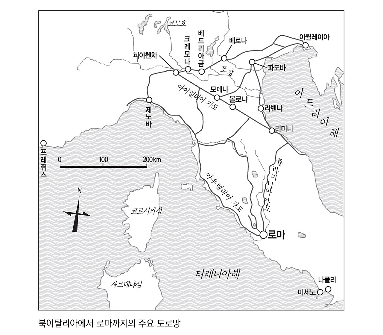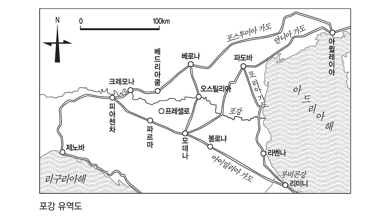 포강을 건너면 거의 직선으로 리미니까지 뻗어 있는 아이밀리아 가도가 나온다. 아드리아해에 면해 있는 리미니에서는 플라미니아 가도가 아펜니노산맥을 지나 로마까지 곧장 뻗어 있다. 또한 포강을 건너 서쪽으로 가면 피아첸차에서 제노바까지 가도가 뻗어 있고, 제노바에서 로마까지는 역시 아우렐리아 가도가 곧장 뻗어 있다.