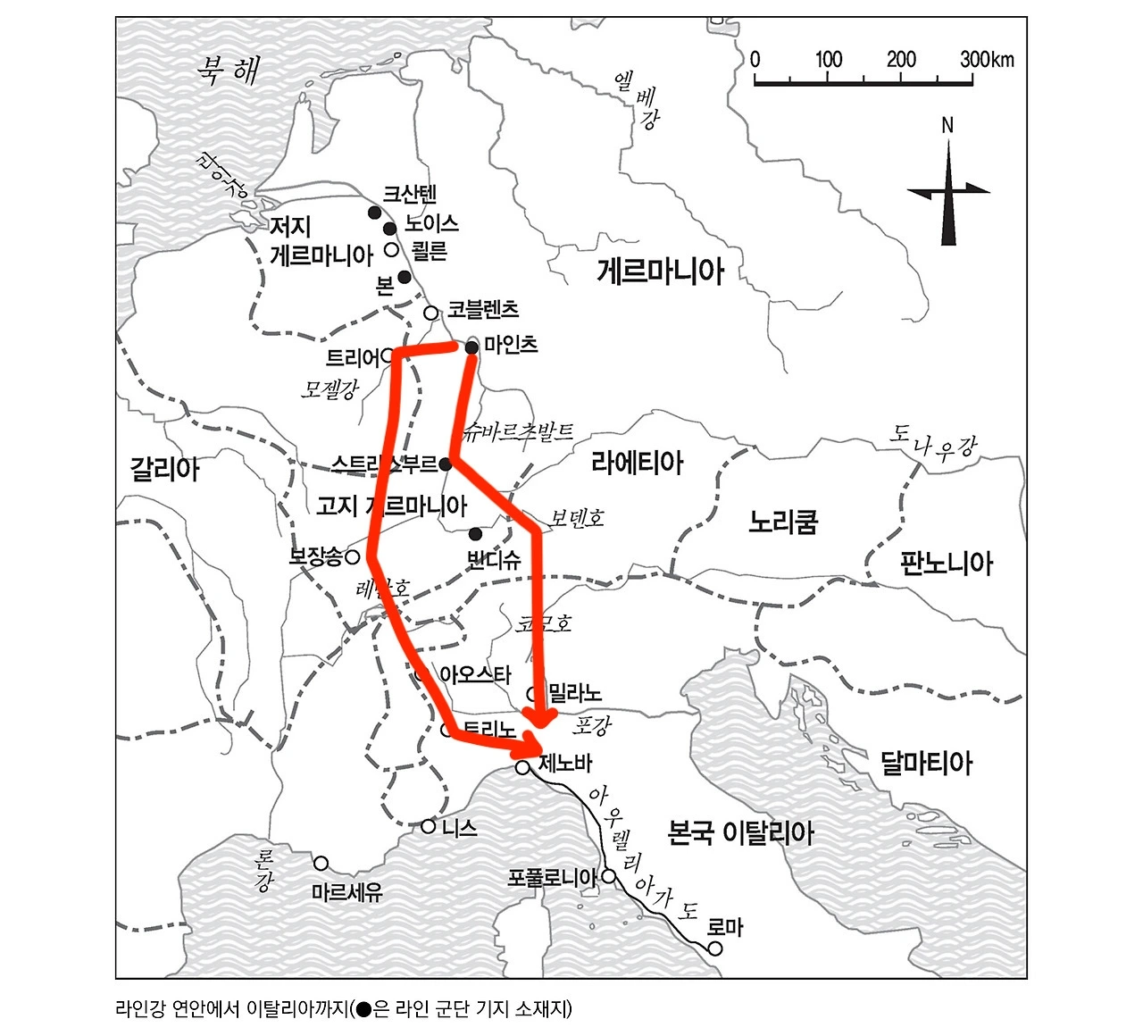 오늘날 프랑크푸르트에서 40킬로미터가량 떨어진 마인츠는 로마 시대에는 중요 군단기지인 모군티아쿰(Moguntiacum, 켈트족의 신의 이름을 따서 만든 이름)이었다. 라인강 방위군의 최대 거점인 만큼, 여기서 제국의 수도 로마까지 가는 길은 하나가 아니다. 크게 보아도 길이 두 개 있다.