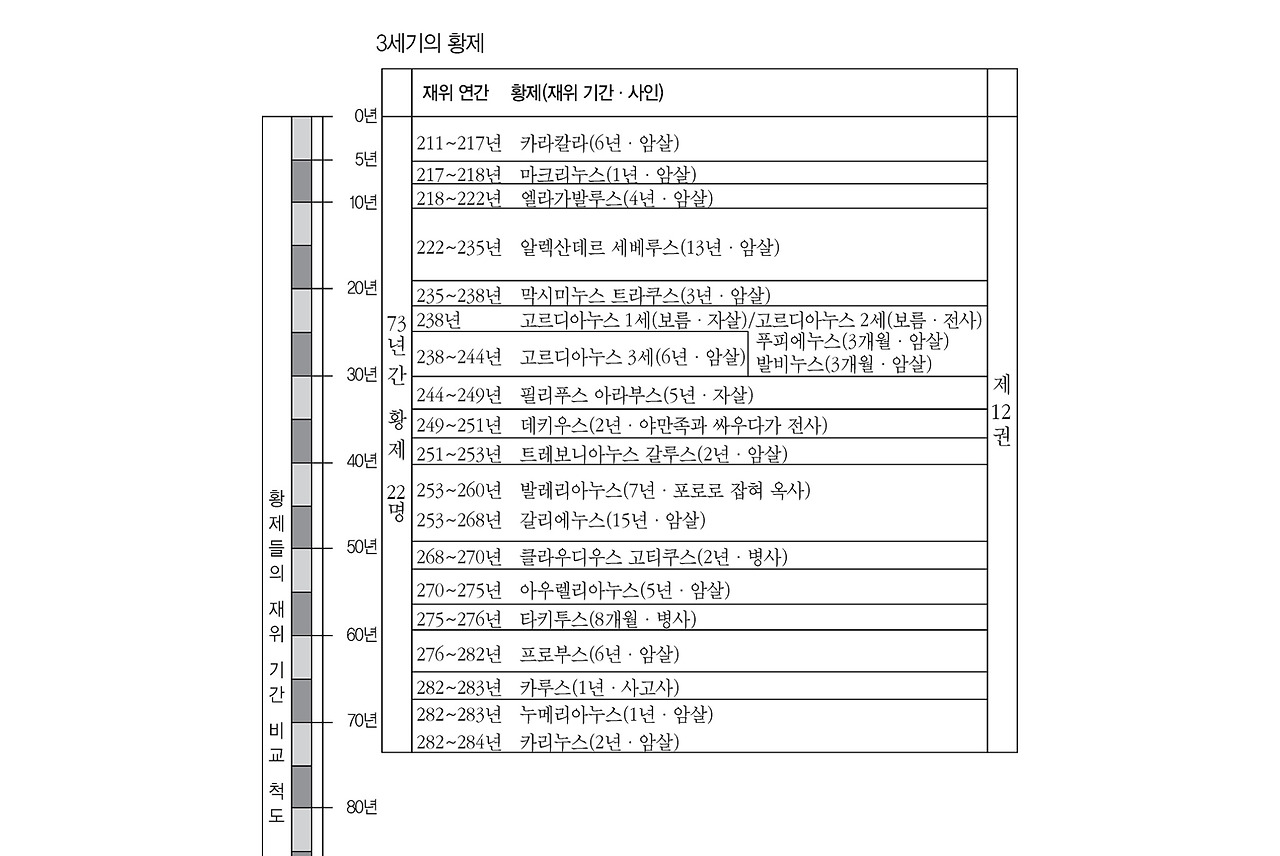 로마인 이야기 제12권 『위기로 치닫는 제국』에서 다룬 시기는 서기 211년부터 284년까지 73년간이다. 이 시기에 원로원에 의해 공식적으로 승인된 로마 황제만 해도 총 22명이다. 이 시대가 로마 역사에서 특별히 '위기의 3세기'로 불리게 된 것은 로마 황제가 산 채로 적에게 붙잡히는 전대미문의 불행을 당했기 때문만은 아니다. 그 이전의 수많은 위기와 3세기의 위기는 '위기'(crisis)라는 말은 같아도 그 성질이 전혀 다르기 때문이다.