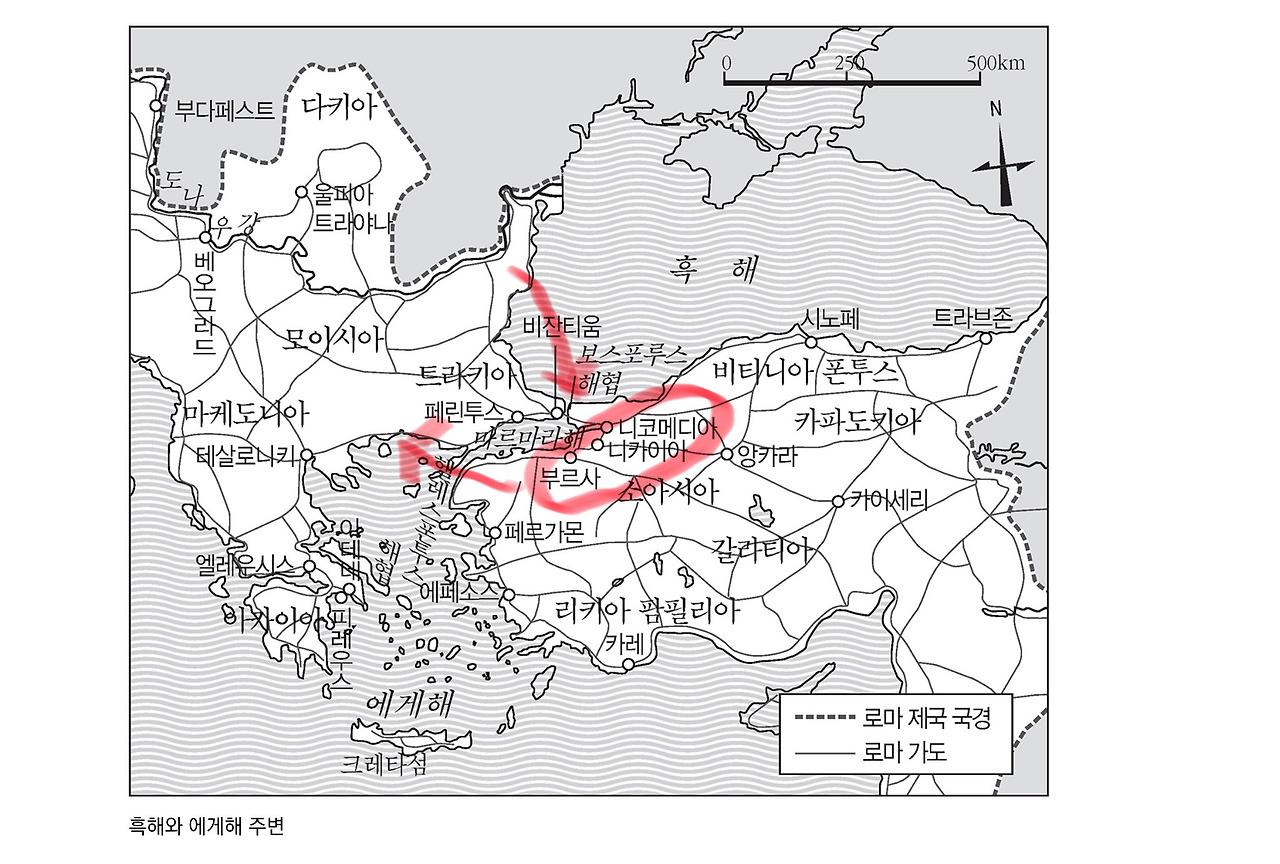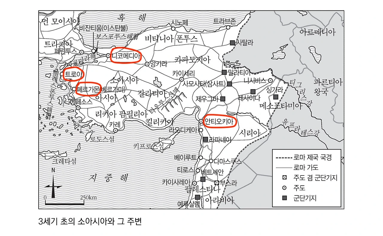 다시 북동쪽으로 방향을 돌려, 겨울을 나기 위해 니코메디아(현 튀르키예 이즈미트)로 갔다. 마르마라해에 면해 있고 비잔티움(오늘날의 이스탄불)과도 가까운 니코메디아는 여러 가지로 중요하다. 비티니아 속주의 주도일 뿐만 아니라, 보스포루스해협이 가까이 있어서 흑해의 제해권을 지키는 후방기지 역할도 맡고 있었다.