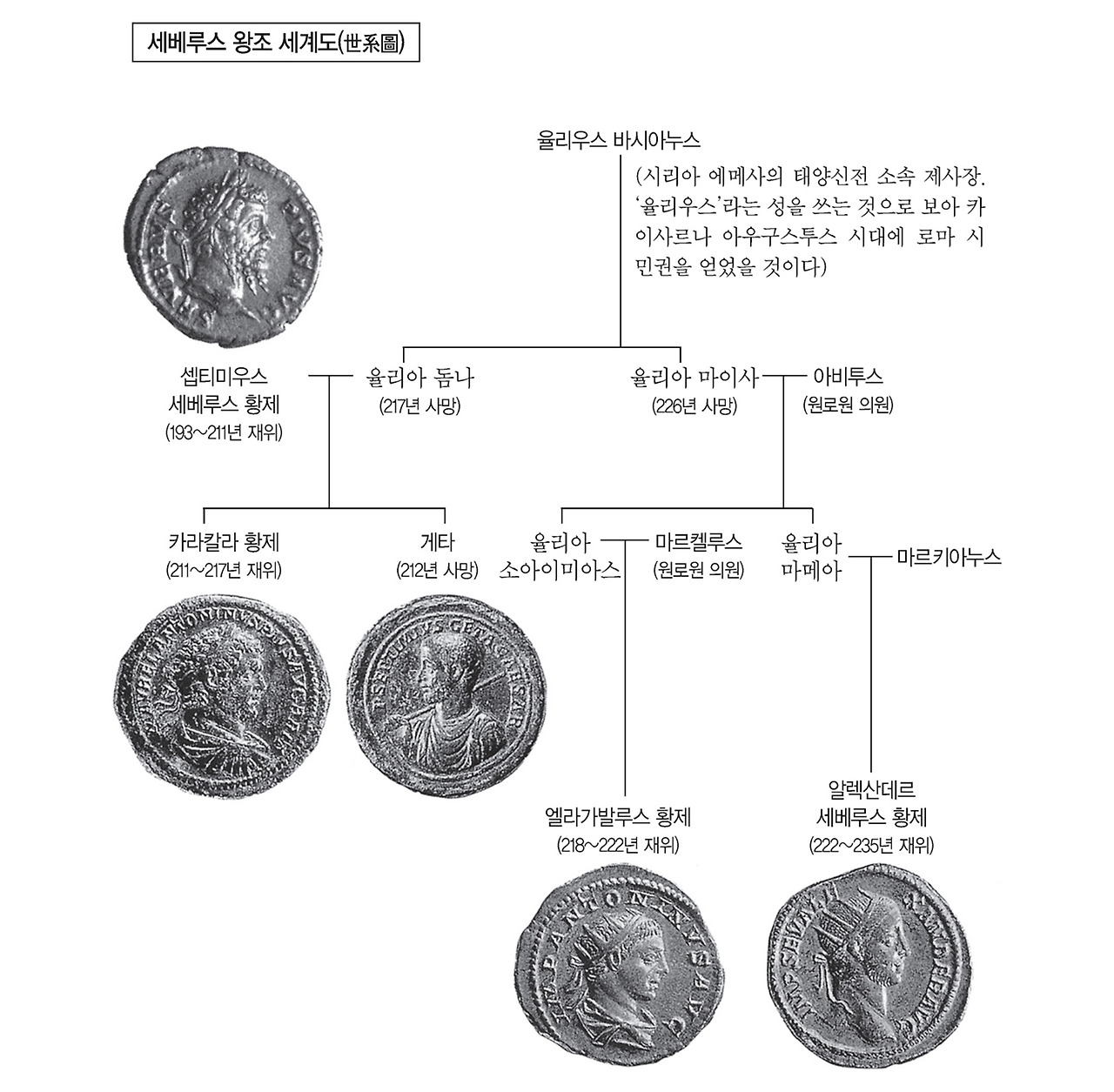 황후가 된 율리아 돔나에게는 율리아 마이사라는 여동생이 하나 있었는데, 그 율리아 마이사도 고향 시리아를 떠나 로마의 팔라티노 언덕 전체를 차지한 웅장한 황궁에서 살게 되었다. 시리아의 태양신을 모시는 사제의 딸도 이제 황제의 처제였다. 결혼 상대도 원로원 의원이었다. 그런데 조카인 카라칼라 황제가 죽자 수도 로마에서의 화려한 생활도 막을 내렸다.