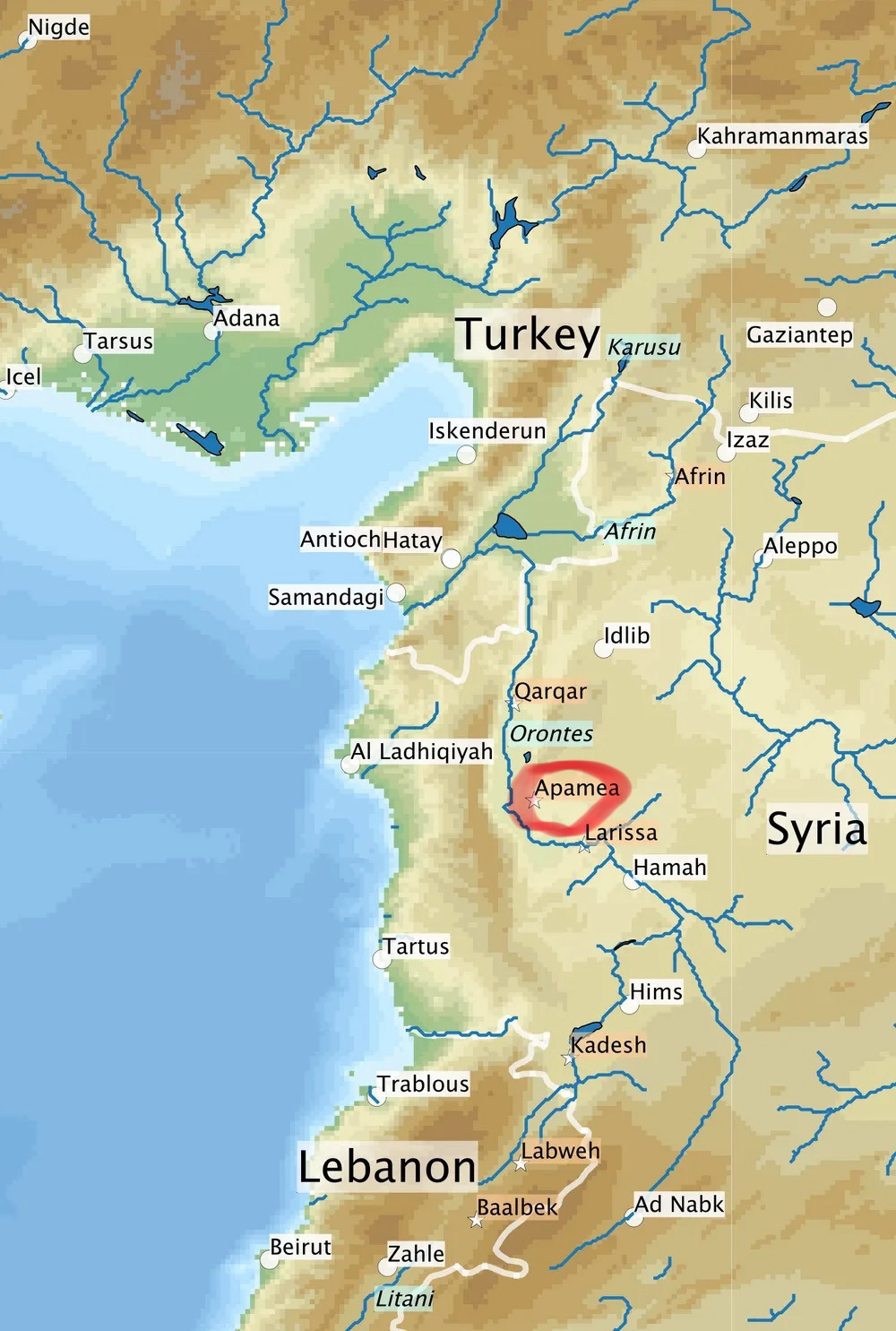 에메사에서 북쪽의 안티오키아로 올라가는 길에 아파메아라는 도시가 있다. 마크리누스 황제는 파르티아와 강화를 맺은 뒤 메소포타미아 속주에서 철수한 제1파르티카 군단과 제3파르티카 군단 장병들을 주둔지가 결정될 때까지 이 아파메아에 놓아두었다.