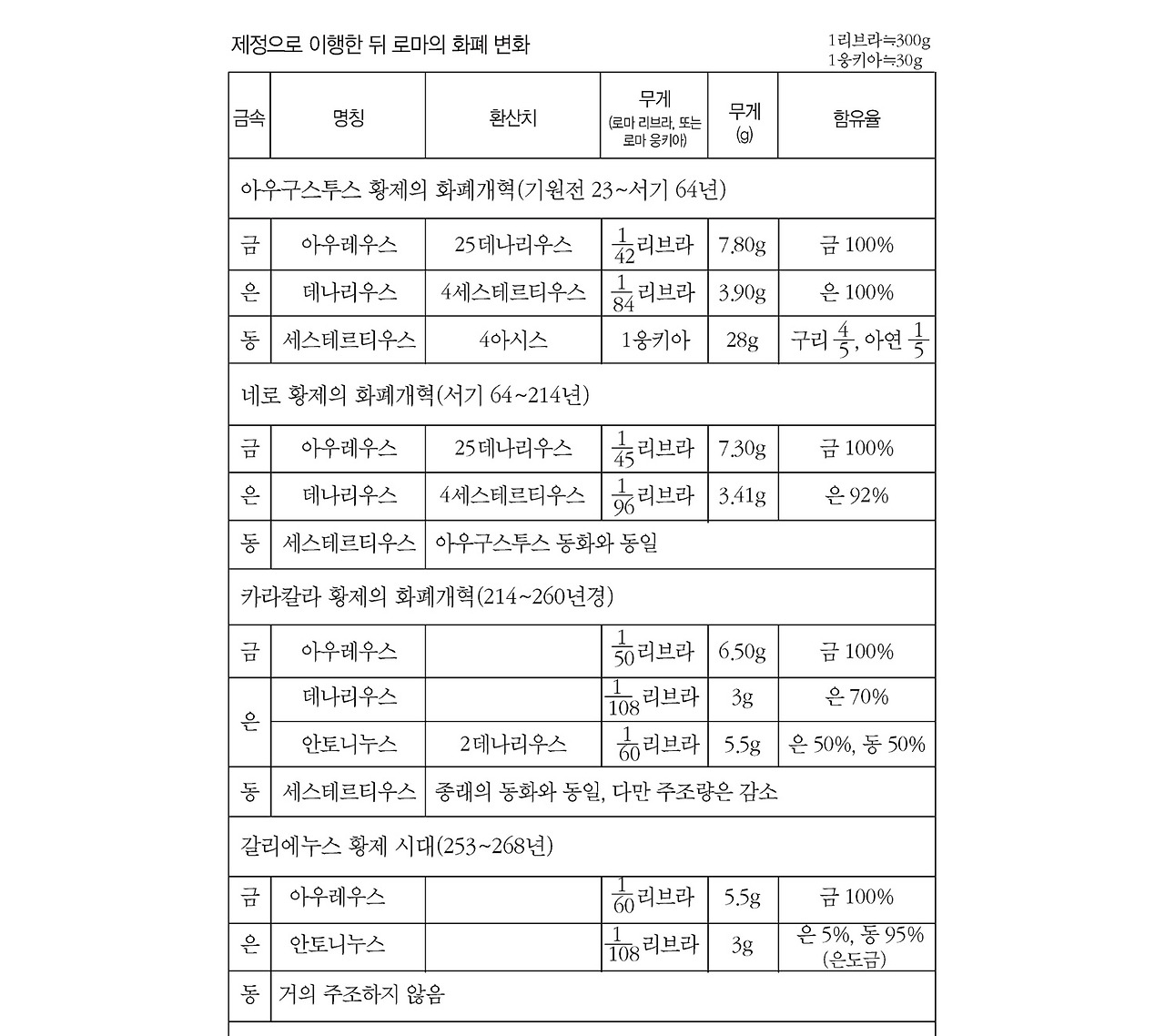 로마 제국의 기축통화는 ‘아우레우스 금화’와 ‘데나리우스 은화’와 ‘세스테르티우스 동화’ 세 종류다. 그중 ‘데나리우스 은화’는 특히 중요했다. 속주에 파견되는 관료의 급료와 군단병의 연봉도 모두 데나리우스 은화로 표시되었다.
