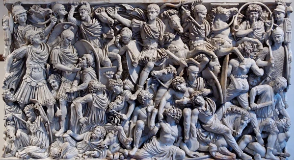 이 부조만 보면 로마 쪽이 이긴 것처럼 보인다. 중앙에서 말을 달리는 에트루스쿠스는 승리자처럼 묘사되어 있다. 하지만 이 전투에서 로마군은 패배했고, 젊은 황제 에트루스쿠스는 전사했다. 이 거대한 대리석관은 에트루스쿠스의 죽음을 슬퍼한 그 어머니가 만들게 했다고 한다.