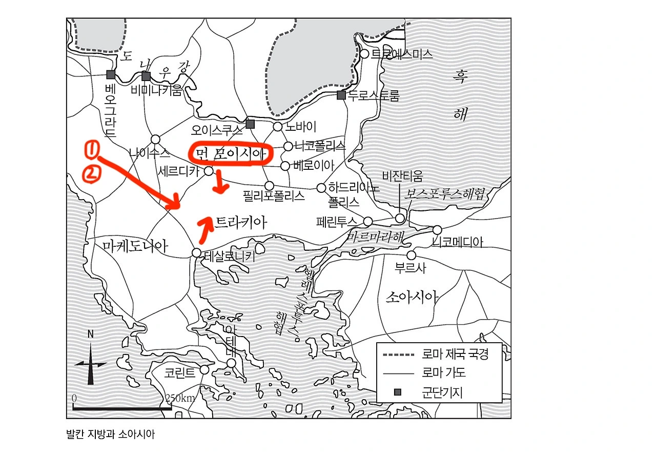 이후 좁은 헬레스폰투스해협을 건너 소아시아로 들어간 카라칼라는 정치적으로나 군사적으로 중요한 니코메디아로 곧장 가지 않고, 당시 일리움이라고 불린 트로이로 직행했다. 카라칼라가 동경하는 알렉산드로스 대왕이 『일리아스』를 애독했기 때문이지만, 페르시아 원정을 앞두고 이곳을 찾은 젊은 대왕과 똑같은 일을 카라칼라도 해보고 싶었을 것이다.