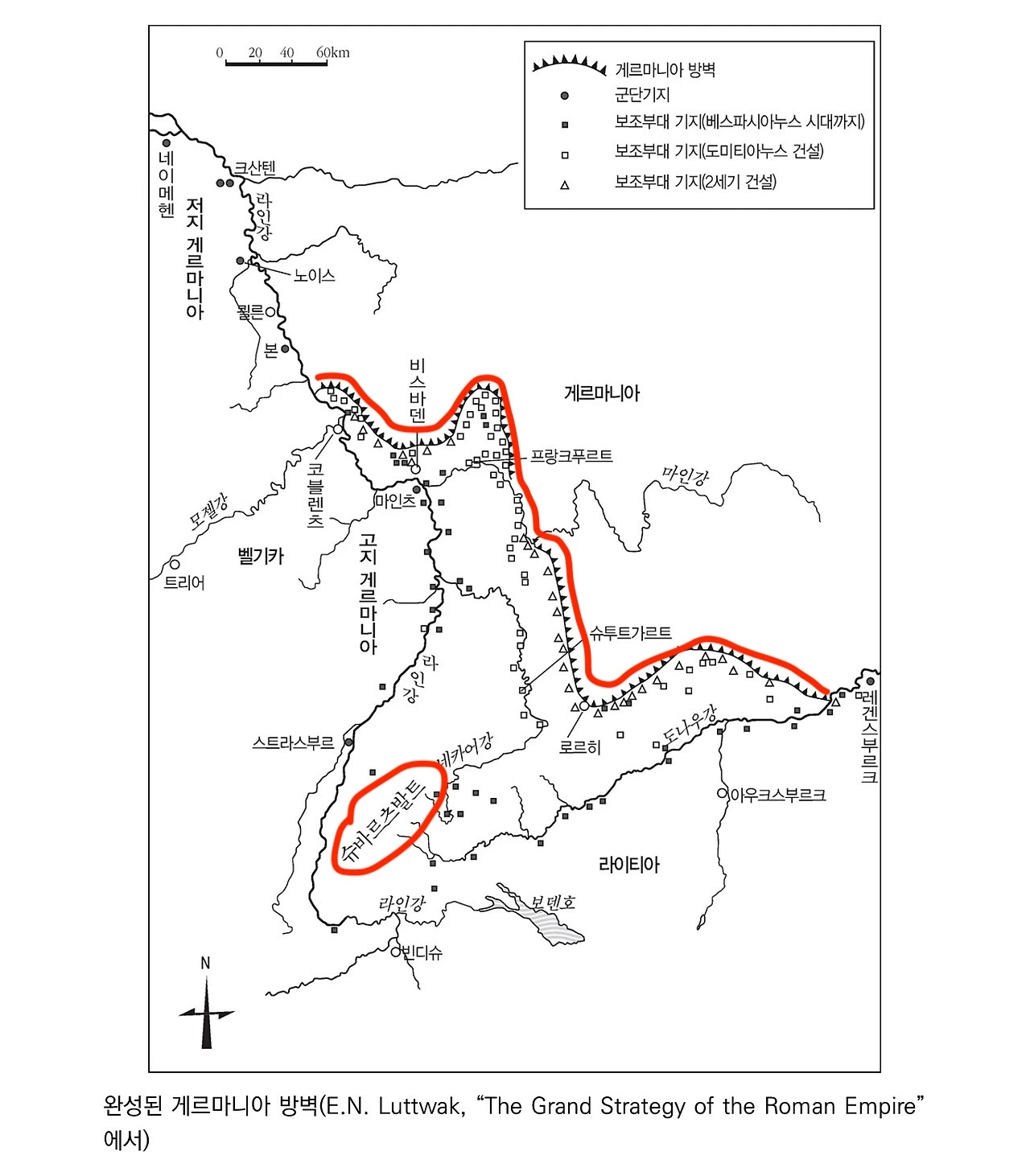 황제가 주로 정비한 곳은 라인강 방위선과 ‘게르마니아 방벽’ 주변이다. 먼저 주변 도로망을 정비하였고, 20대 전반의 젊은이답게 우선 ‘게르마니아 방벽’을 넘어가서 방어에 나선 게르만 군대를 철저히 쳐부순 다음에 개수공사를 시작하는 방식을 택했다. 깊이 파 내려간 참호 안쪽에 목책만 쳐두었던 곳도 돌과 벽돌로 보강했다.