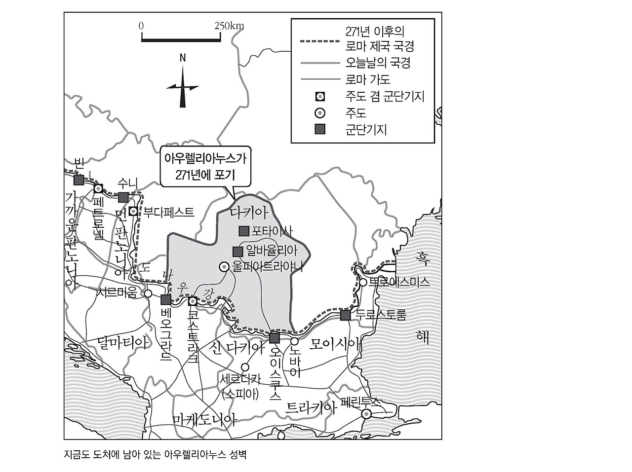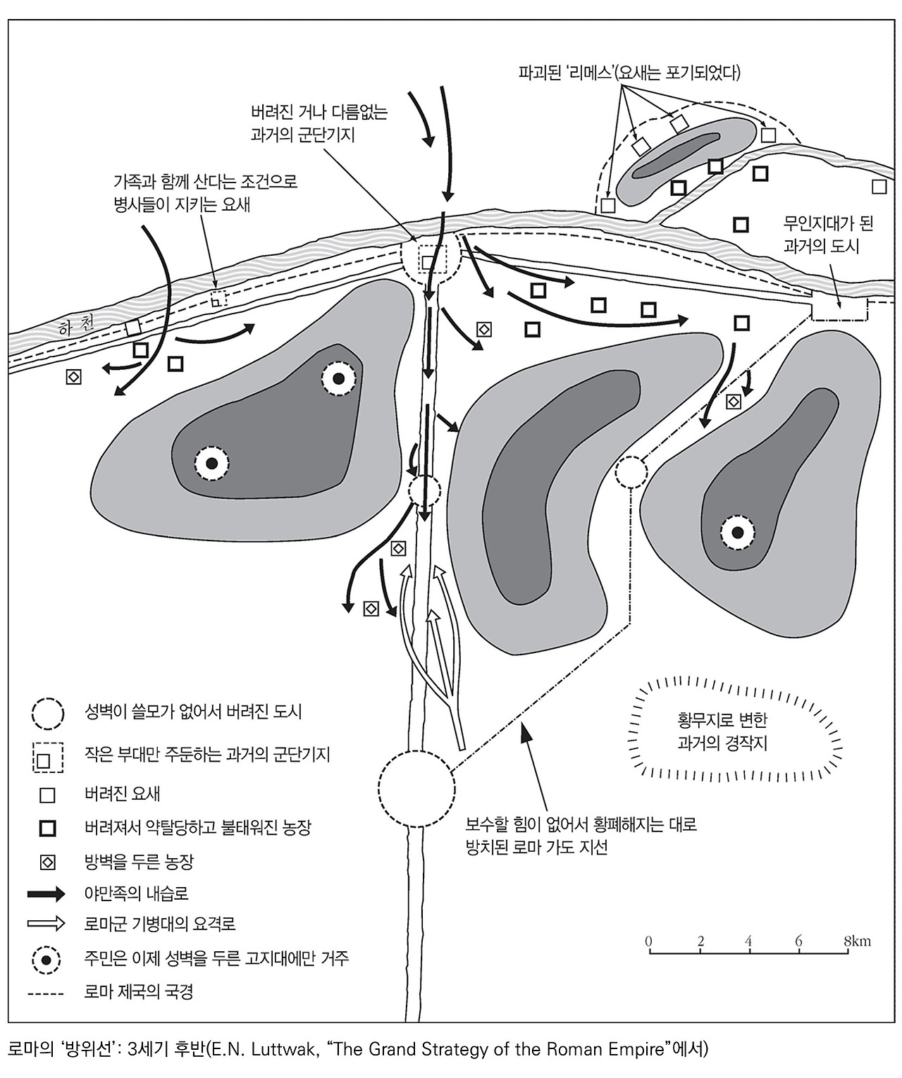 그 전략이 무너진 시대를 나타낸 것이 다음 그림이다. ‘방위선’은 곳곳이 뚫리고, 게다가 별로 간격을 두지 않고 자주 되풀이되었다. 도시는 물론 마을에서도 거주지역 주위에 높은 방벽을 둘러치게 되었다. 군단기지조차 높은 탑과 견고한 성벽을 짓고, 성벽 주위에는 깊은 참호를 파고, 강물을 끌어들인 해자로 둘러싼 성벽 안에 자주 틀어박히게 되었다.