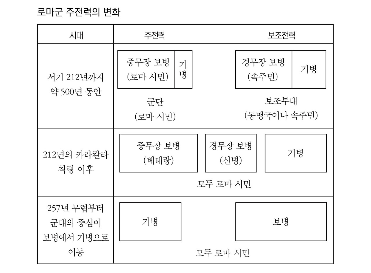 로마의 군제는 줄곧 로마의 사회 구성을 반영했기 때문에, 군제의 변화는 사회 구성의 변화를 수반할 수밖에 없었다. 중무장 보병인 군단병이 전쟁터의 주역에서 밀려난 것은 도시국가의 다수파였던 시민으로 구성된 시민병이 주역의 자리에서 내려와 사회에서 소수파인 기병에게 그 자리를 넘겨주었다는 뜻이다.