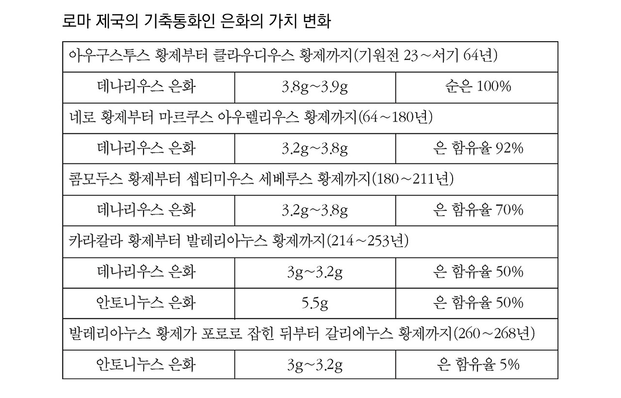 로마 황제들은 그 ‘적자’를 어떻게 메웠을까. 결국 은화의 순은 함량을 줄이는 방법으로 곤경을 타개하려고 했다. 카라칼라는 순은 함량이 50%까지 떨어진 ‘데나리우스 은화’와 병행하여 함량은 그대로 두고 무게만 5.5g으로 두 배 가까이 늘린 ‘안토니누스 은화’를 새로 등장시켜 은화의 가치 저하를 막으려고 했다.