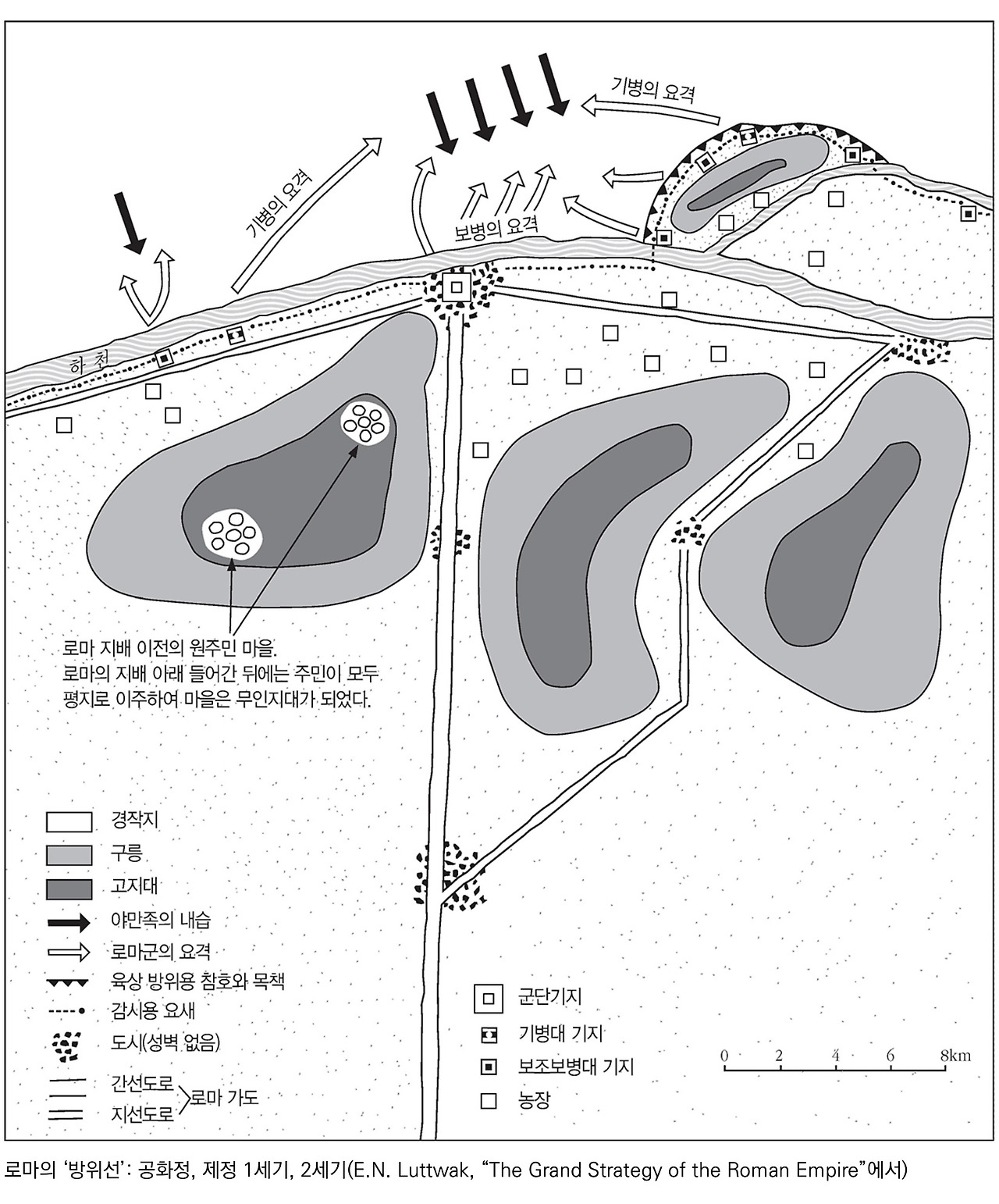 아래 그림은 로마군이 적지로 진격하여 적이 당분간 재기하지 못할 만큼 격파하는 방법으로 로마 제국을 야만족의 침입에서 지키는 방위전략을 채택했던 시대의 국경 상황이다. 한마디로 말하면 ‘공격은 최상의 방어’를 그림으로 그려놓은 듯한 전략이다. 이 시대에 제국의 ‘방위선’은 철벽이었다 해도 지나친 말이 아니다.