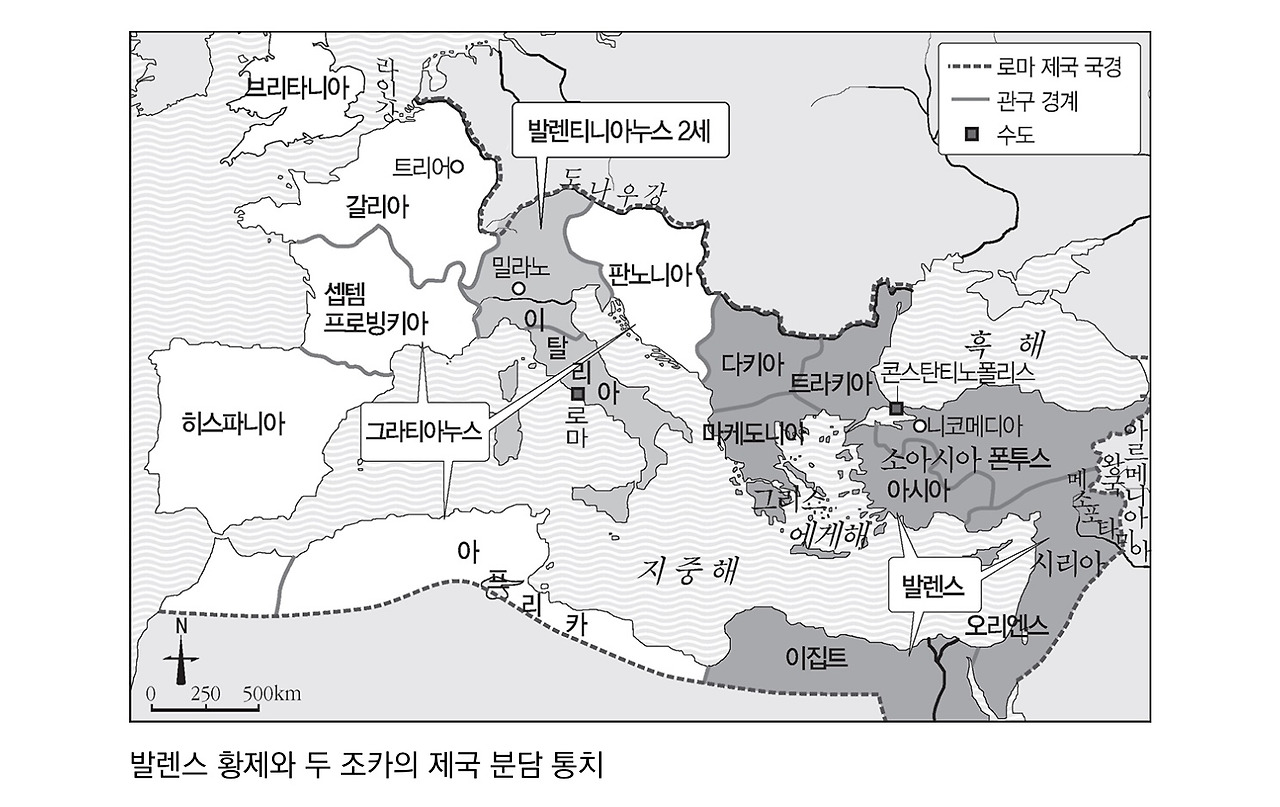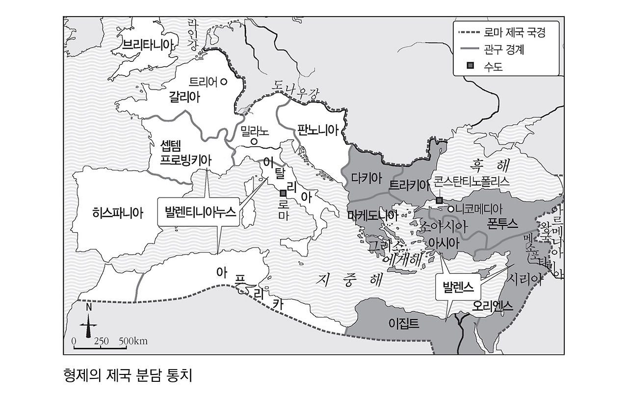 형제는 위의 지도처럼 제국을 양분했다. 형은 서방, 동생은 동방을 맡았다. 형이 서방을 맡은 것은 이 시기에는 문제가 제국 서방에 집중되어 있었기 때문이다. 로마 황제에게 ‘문제’는 무엇보다도 외적으로부터 나라를 방위하는 것을 의미했다.