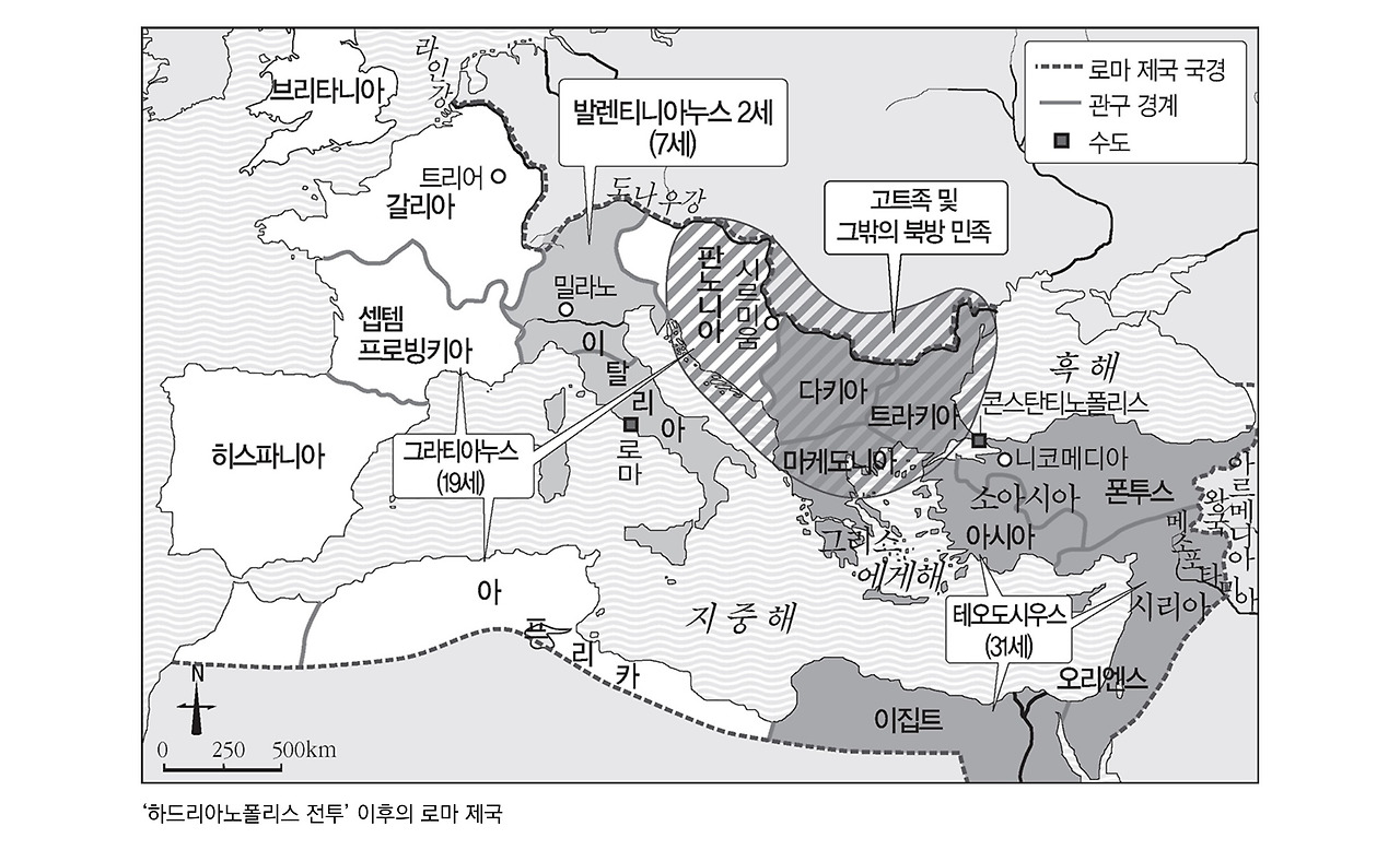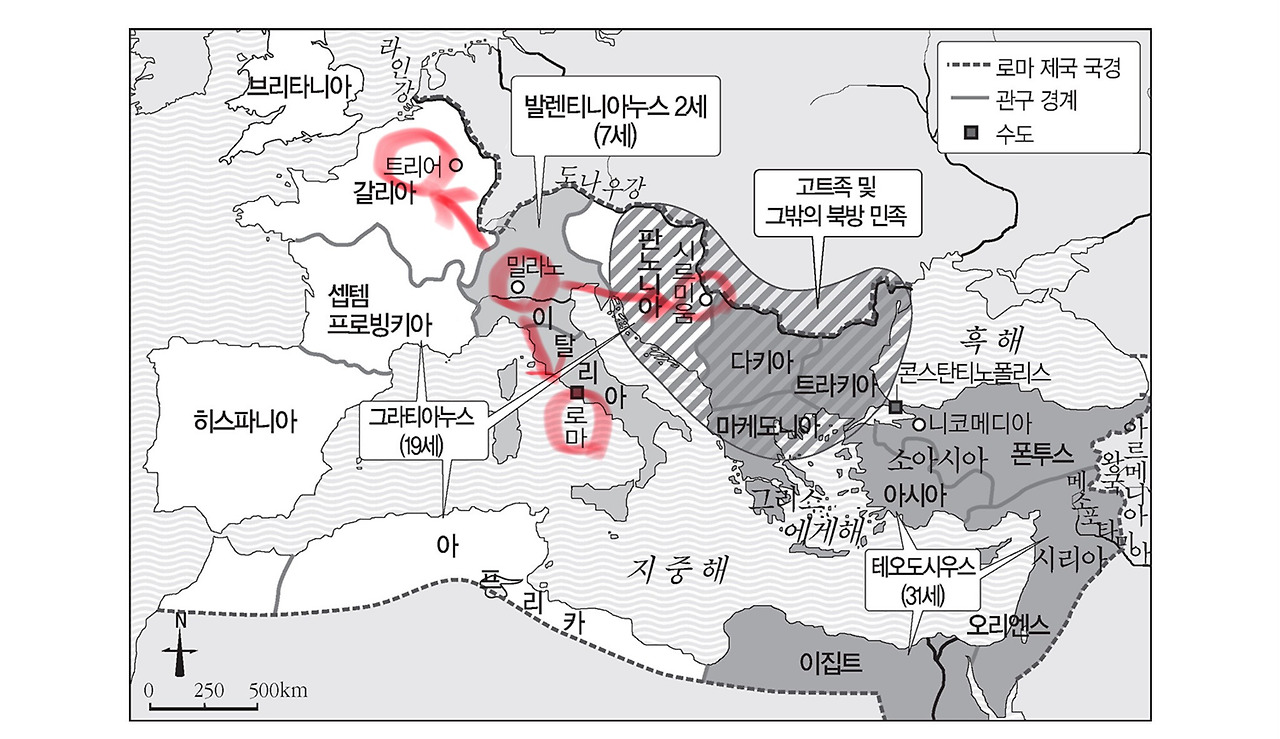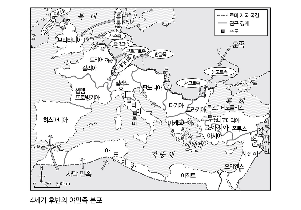 동방의 적인 페르시아와는 달리 서방의 적인 북방 야만족은 아무리 격파해도, 또는 반대로 아무리 자기편으로 끌어들여도, 그 수가 줄기는커녕 계속 늘어났다. 먹고살 수 없는 사람들이 먹고살 수 있는 곳으로 몰려드는 것은 자연스러운 추세다.