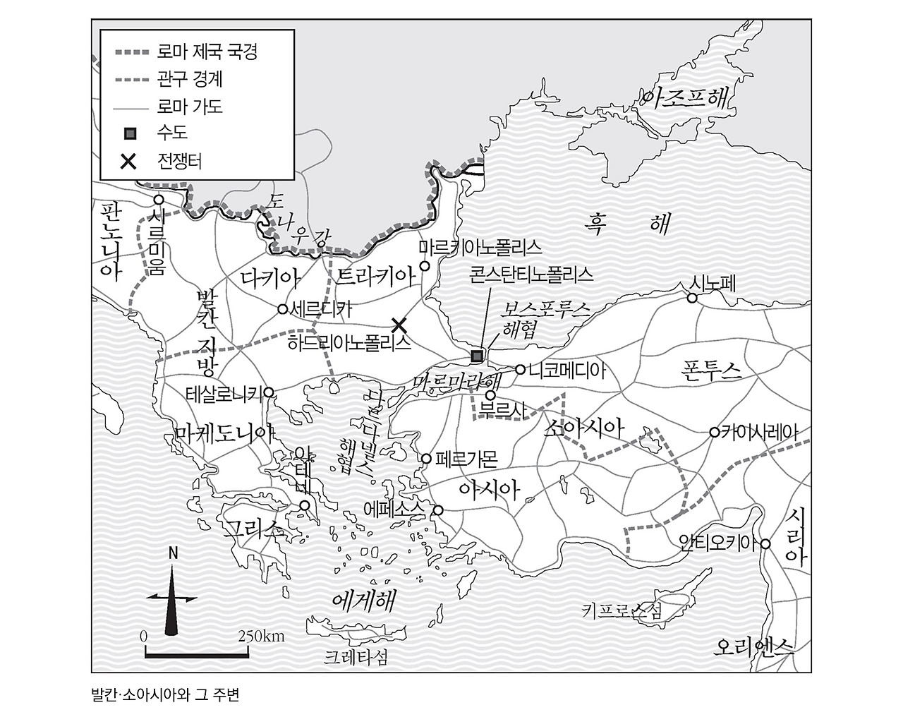 지금까지는 황제들이 통치를 분담해도 그것은 어디까지나 분할이 아니라 분담이었고, 로마 제국은 하나였다. 그래서 나도 ‘제국 동방의 황제’나 ‘제국 서방 담당’이라고 일일이 말하지 않으면 안 되었다. 하지만 이번의 로마 제국의 분할은 결정적이었다.