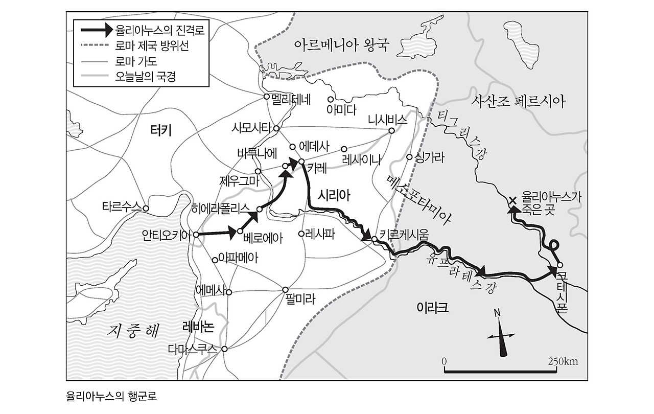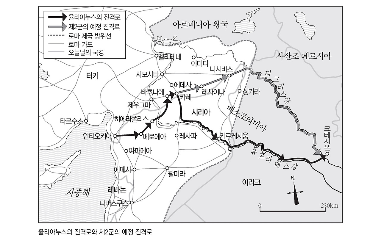 과연 샤푸르도 두 번의 패배는 아팠는지, 그 후에는 다시 파상 공격을 되풀이하는 게릴라 전법으로 되돌아간다. 로마 병사들에게는 그것이 끝없이 이어지는 고행으로밖에 여겨지지 않았다. 유프라테스강을 건너면 로마 영토로 돌아갈 수 있다. 그런데 유프라테스강은커녕 티그리스강도 건너지 않았다.