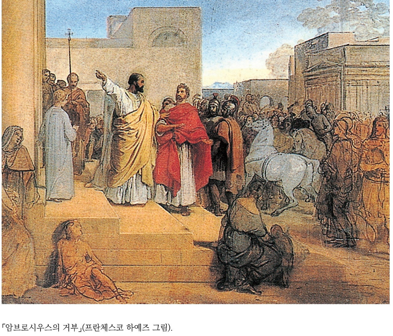암브로시우스는 기독교와 세속 권력의 관계를 참으로 정확하게 파악하고 있었던 게 분명하다. 황제가 그 지위에 앉는 것도, 권력을 행사할 수 있는 것도 신이 인정했기 때문이고, 신의 뜻을 인간에게 전하는 것이 주교로 되어 있는 이상, 아무리 황제라 해도 주교의 뜻을 거역할 수는 없다. 이것이 바로 양자 관계의 진실이다라고.