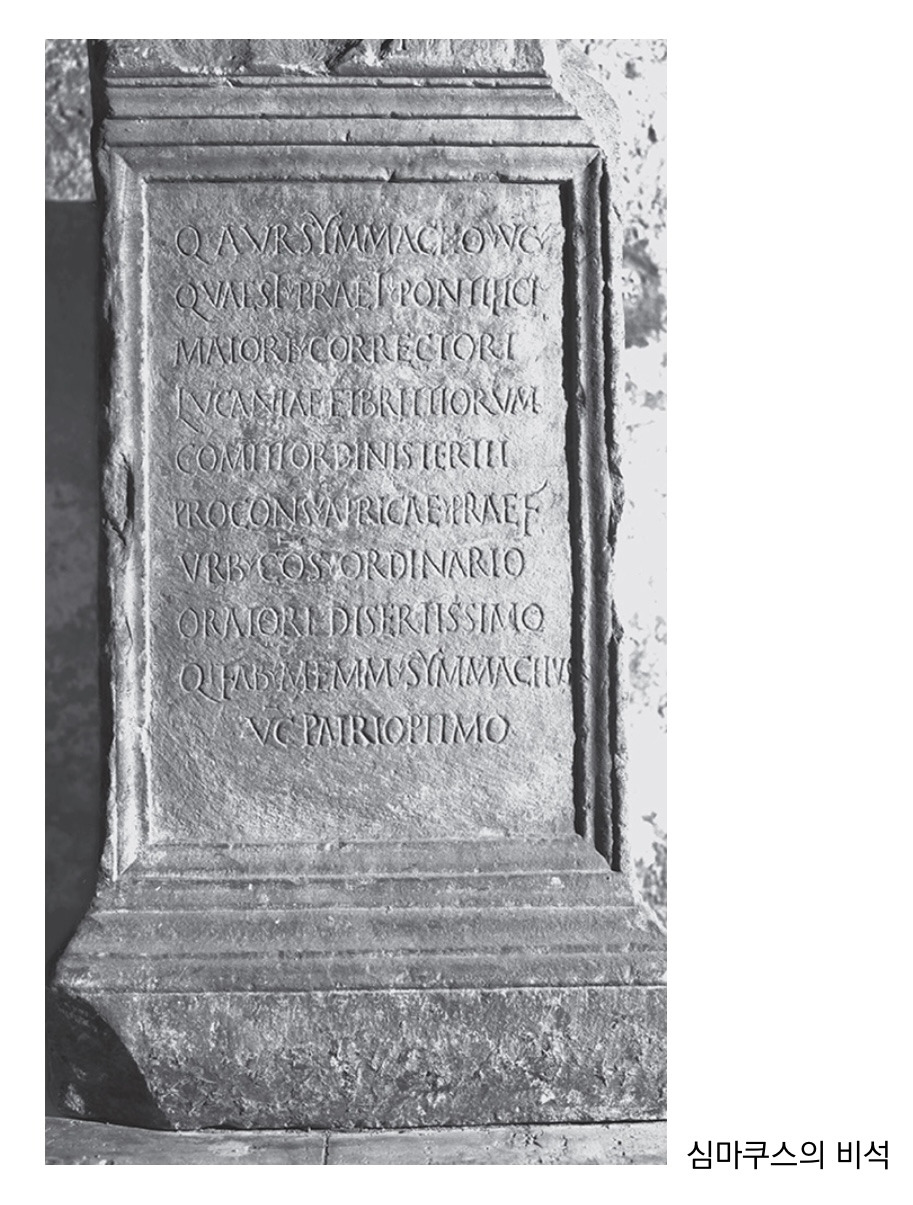 퀸투스 아우렐리우스 심마쿠스(Quintus Aurelius Symmachus)는 서기 340년에 수도 로마에서 태어났다. 이 사람은 출생도, 받은 교육도, 공직 경력도 열 살 위인 암브로시우스와 비슷하다. 하지만 이 사람의 경우에는 개인 이름과 가문 이름과 가족 이름이 모두 알려져 있다. 그것은 암브로시우스와 달리 그가 공직 생활을 하고 있는 도중에 기독교회에 스카우트되지 않았기 때문이다.