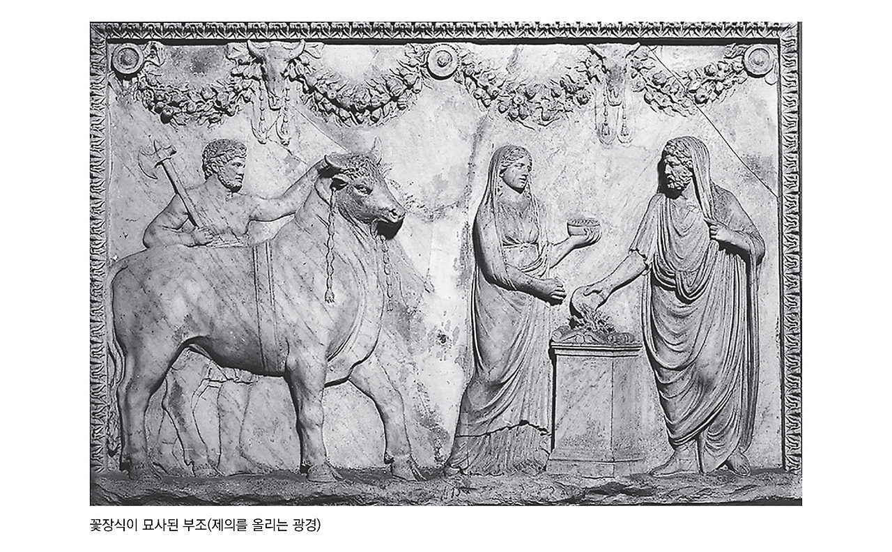 꽃장식이란 로마인이 특히 좋아한 장식인데, 나뭇잎과 꽃을 엮어서 길쭉한 타원형 화환을 만든다. 하얀 대리석이나 회반죽을 바른 벽에 초록색과 가지각색의 꽃으로 만든 꽃장식은 잘 어울려서 한층 돋보인다. 로마인은 기회 있을 때마다 모든 곳을 꽃장식으로 꾸미기를 좋아했다. 따라서 제의에만 쓰이는 장식은 아니었지만, 그리스 시대부터 제의에는 반드시 수반되는 장식이었던 것도 확실하다. 이런 금지령을 어긴 자는 많은 벌금을 물어야 했다.