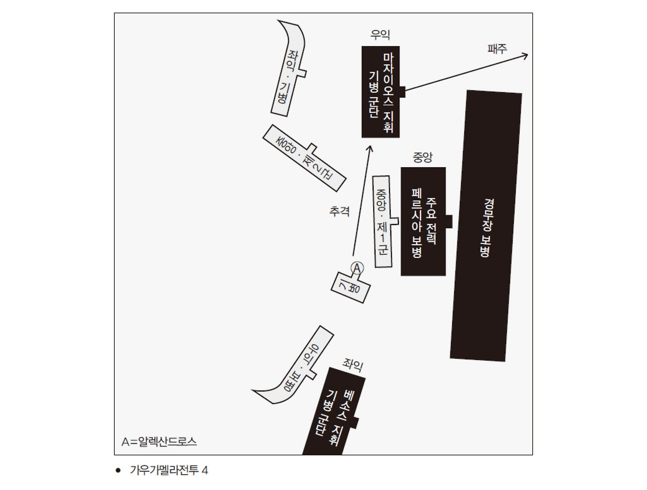 그리스 군대의 좌익과 교전하고 있던 우익의 마자이오스 이하 페르시아 기병은 황제가 달아나는 것을 보고 더 이상 싸울 필요가 없다는 것을 알았다. 그들은 유턴해 전쟁터에서 달아나려고 했지만, 패주하면 통솔력이 급속도로 약해진다. 알렉산드로스 기병은 달아나는 페르시아 기병을 향해 달려들었다(가우가멜라전투 4).
