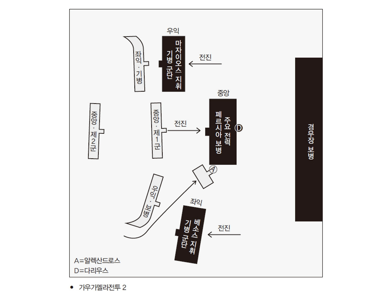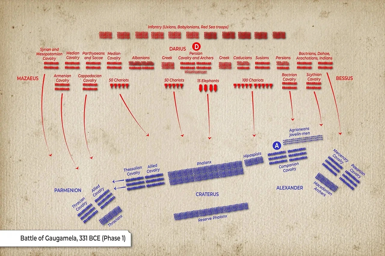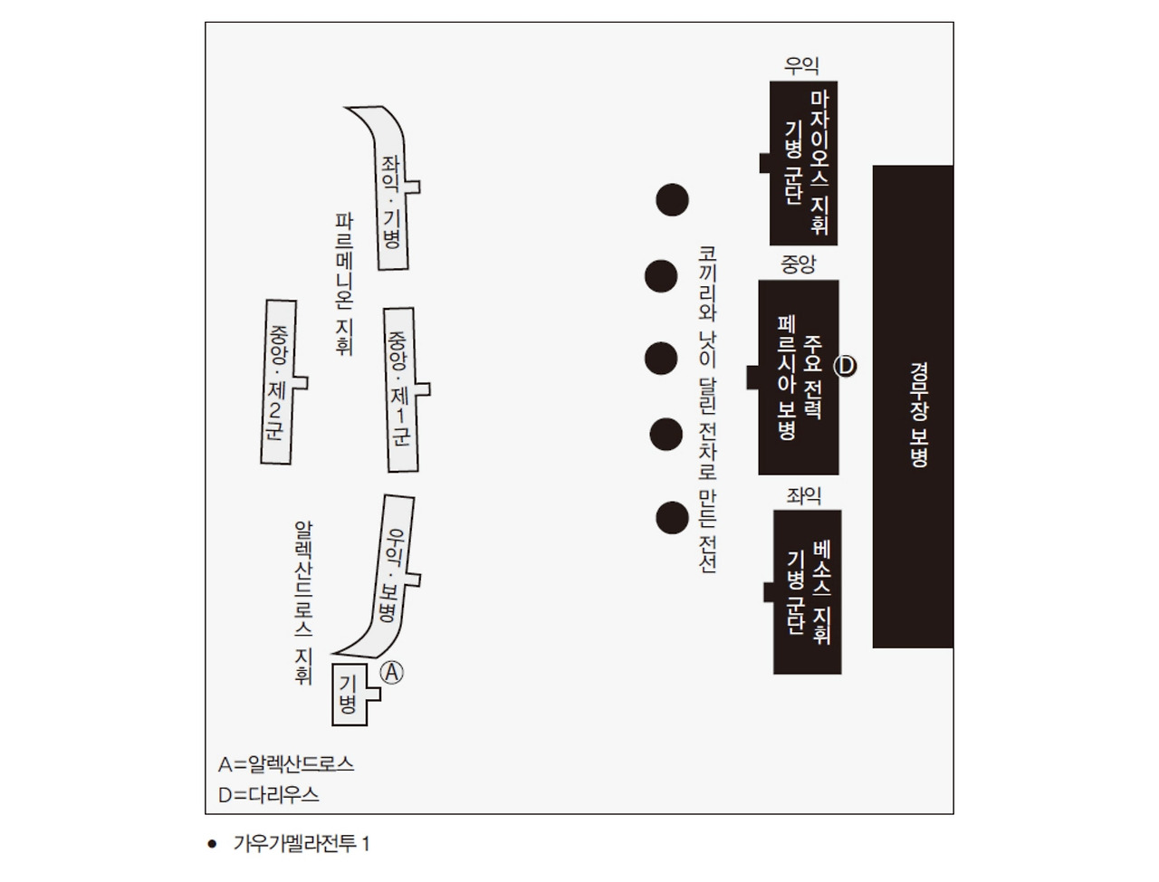 하지만 ‘가우가멜라’에는 양쪽 군대를 나누는 강이 없었다. 개전 직후라고 해도 기다리는 자세를 보여주는 목책도 쌓아두지 않았다. 대신 최전방에는 인도에서 온 15마리의 코끼리와 낫을 단 전차 200대가 5대씩 나뉘어 배치되어 있었다(가우가멜라전투 1). 다리우스가 개전 직후 재빨리 공세를 취하려고 했다는 사실을 보여준다.
