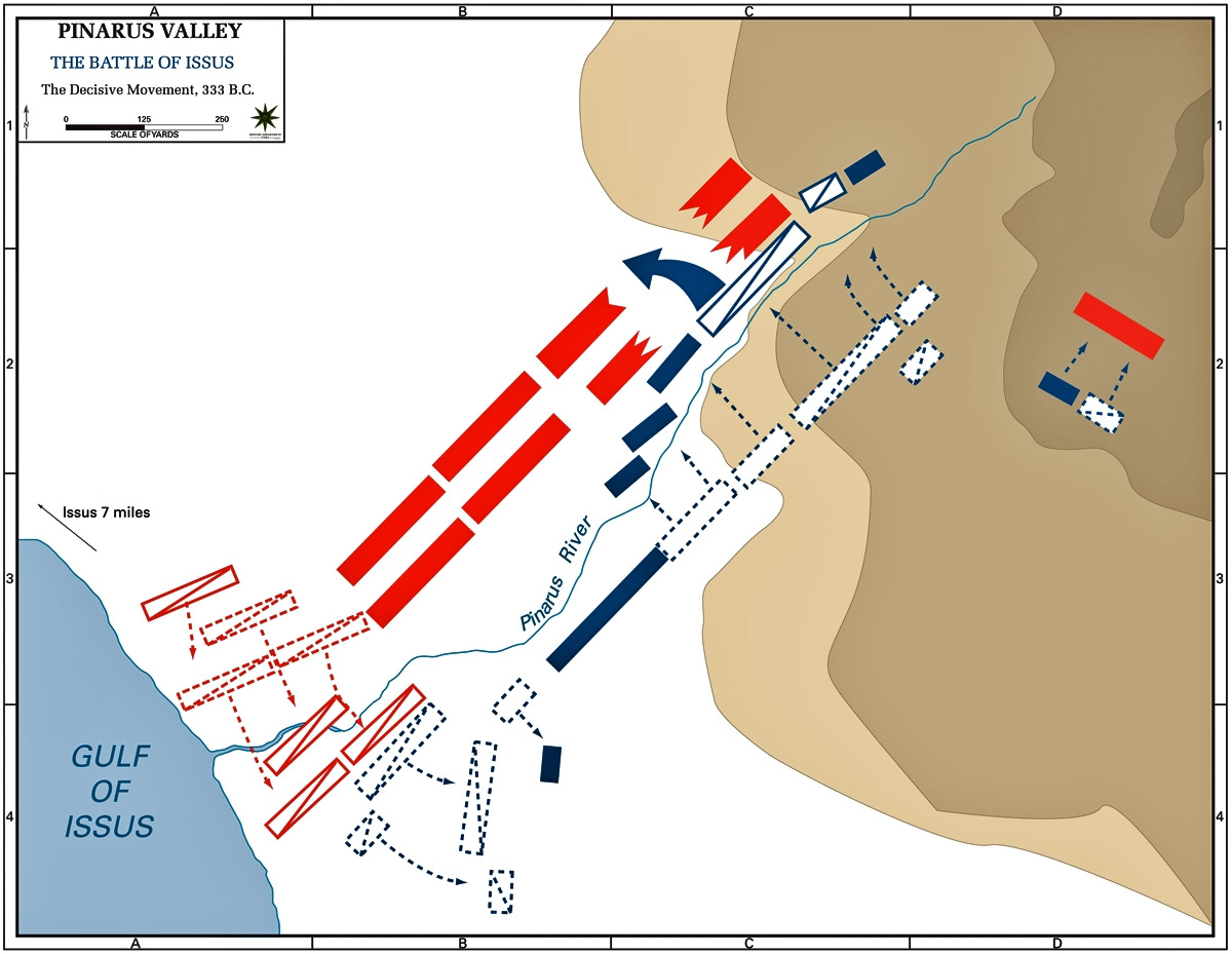 젊은 왕은 이번에도 강물을 튀기면서 강을 건너 돌격했지만 앞서 나가지 않도록 주의했다. 이 마케도니아 기마 군단이 페르시아 쪽 진용에 쐐기를 박는 데 성공했다. 즉 서로 지켜야 하는 페르시아군의 중앙과 좌익이 분리되고 말았다(이소스전투 2).