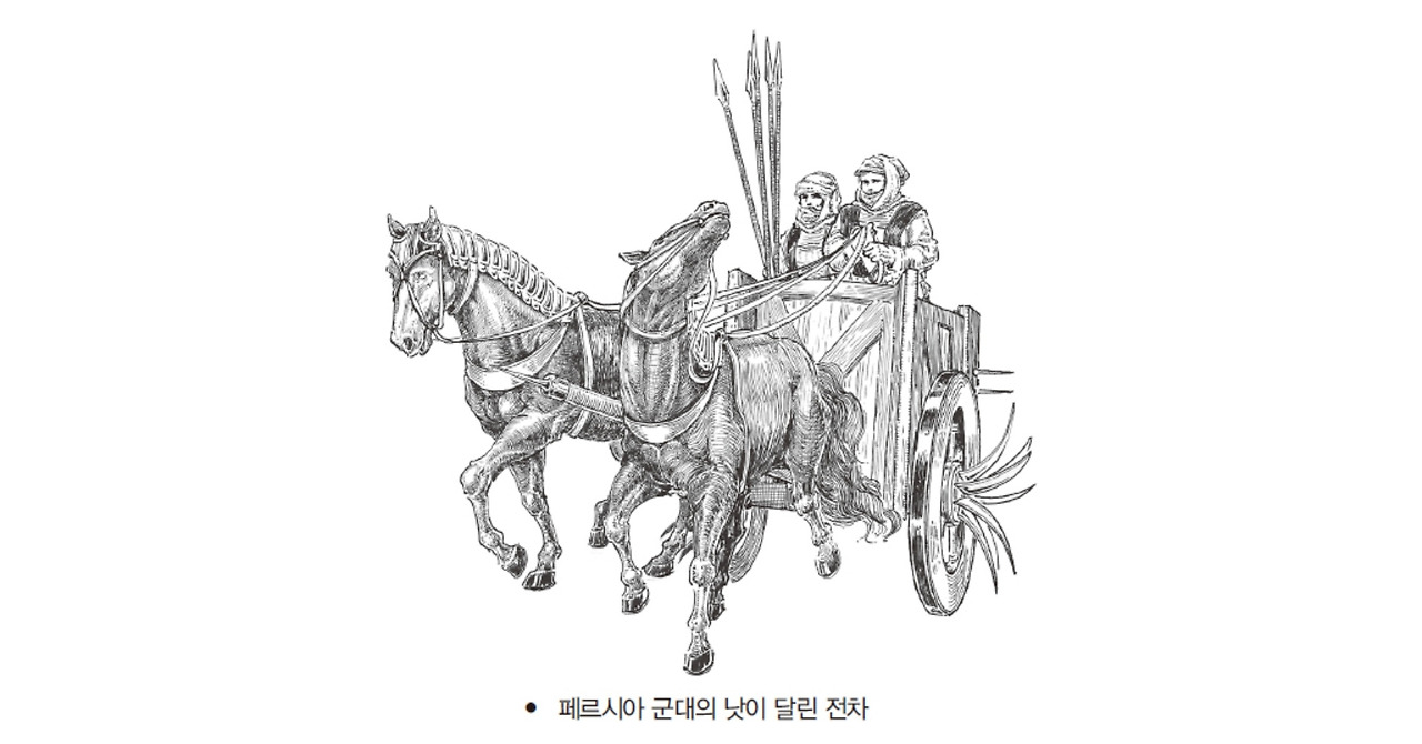 용병 집단 바로 뒤에는 ‘불사신의 남자들’이라 불리는 페르시아의 정예 1만 명이 다리우스가 탄 전차를 에워싸듯 포진하고 있었다. ‘불사신’이라고 불린 것은 전투에서 죽지 않기 때문이 아니라 누군가 전사하면 곧바로 그 자리를 메워 늘 1만 명을 유지했기 때문이다.