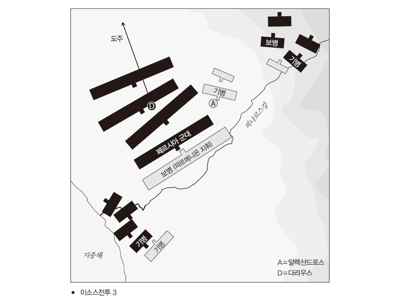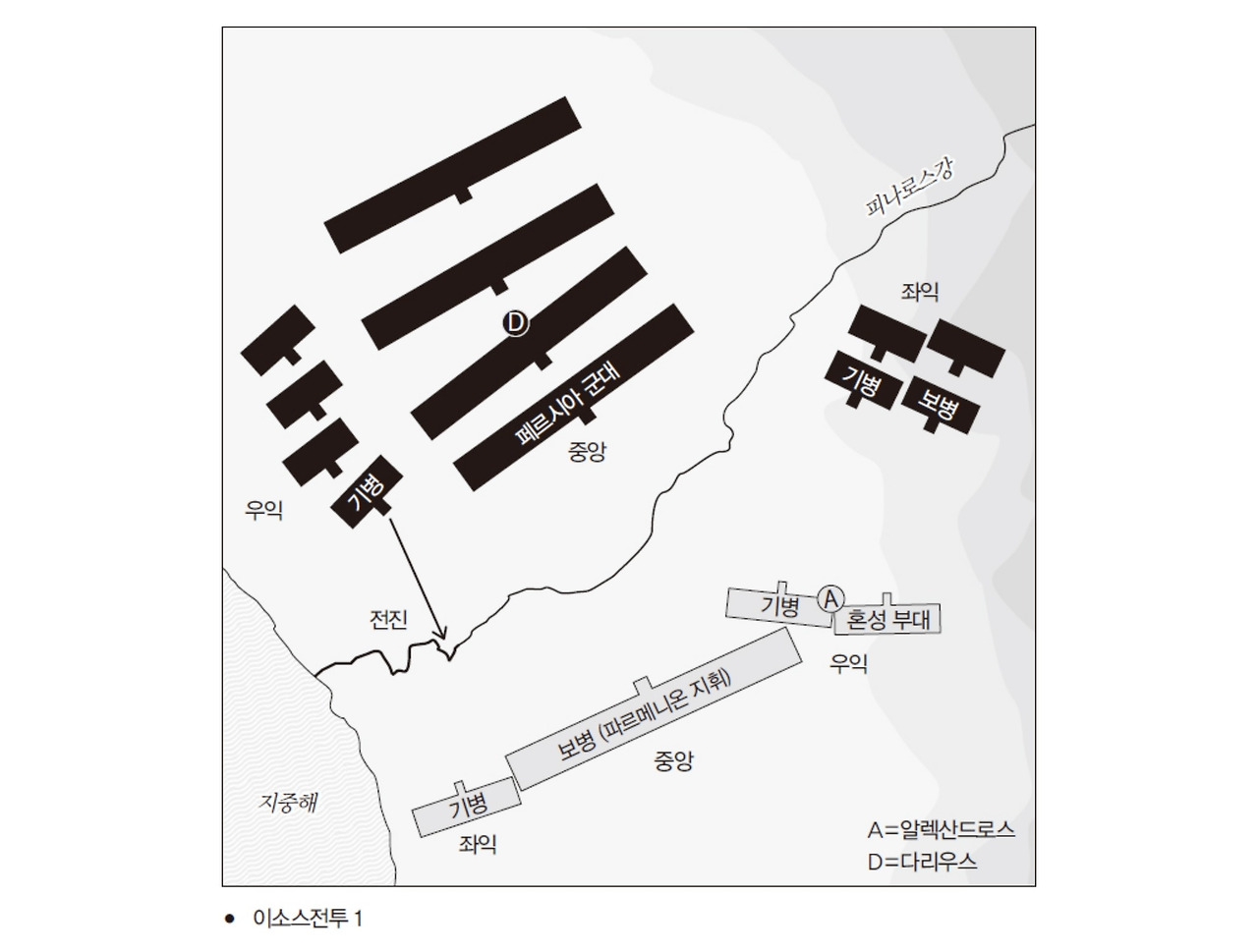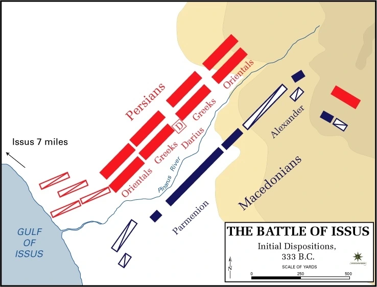 페르시아의 황제는 좌익에 보병과 기병이 뒤섞인 혼성 부대를 배치했는데(이소스전투 1), '그라니코스' 전투의 양상을 듣고 알렉산드로스가 거느린 우익의 돌격을 저지하기 위해 자기 군대의 좌익 가운데 일부에게 미리 강을 건너게 만들어서 그리스 쪽 우익의 측면에 배치했다.