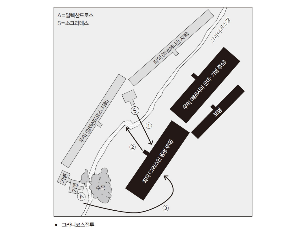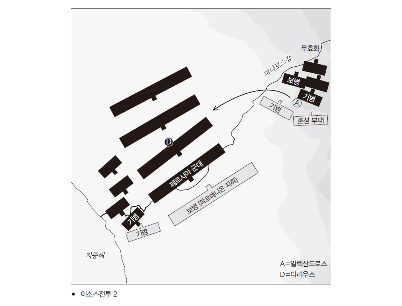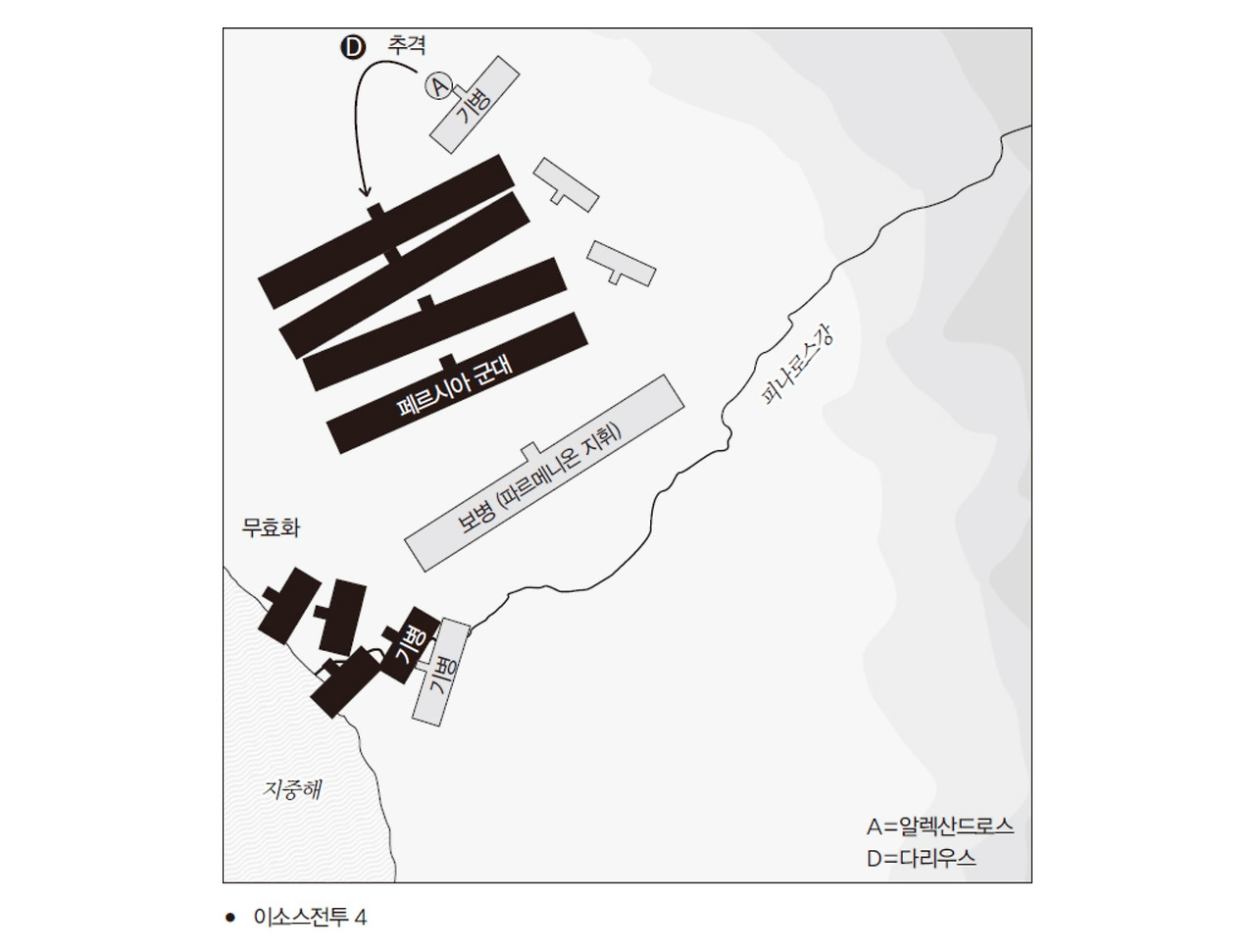 페르시아의 황제는 좌익에 보병과 기병이 뒤섞인 혼성 부대를 배치했는데(이소스전투 1), '그라니코스' 전투의 양상을 듣고 알렉산드로스가 거느린 우익의 돌격을 저지하기 위해 자기 군대의 좌익 가운데 일부에게 미리 강을 건너게 만들어서 그리스 쪽 우익의 측면에 배치했다.