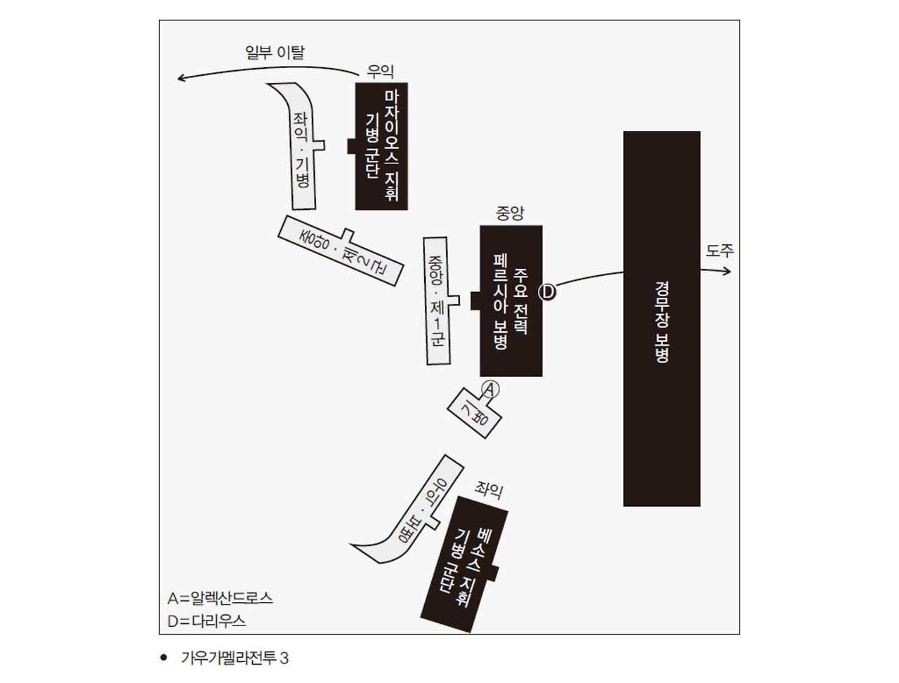다리우스는 자기 병사들을 헤치고 ‘이소스’에 이어 또다시 병사들을 버리고 전쟁터에서 달아났다. 그는 남쪽에 있는 바빌론이나 수도인 수사로 향하지 않고 동쪽으로 끝없이 달아났다. 알렉산드로스가 작전을 마치면 반드시 이 도시를 공략할 것이라고 예상했기 때문이다. 대부분 빗나갔던 다리우스의 예상은 이때만은 적중했다.