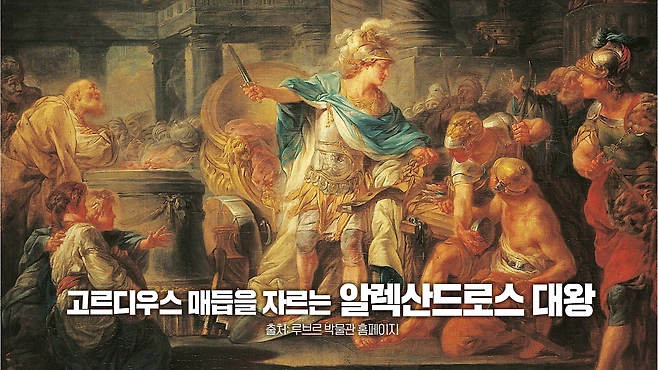 마케도니아의 젊은 왕은 잠시 침묵하면서 매듭을 바라보고 있었지만 오래 망설이지는 않았다. 어떻게 하면 이 문제를 풀 수 있는지 해결책을 찾아내려고 했다. 그러더니 갑자기 긴 칼을 들고 단번에 내리쳤다. 가죽끈으로 묶여 있던 줄은 둘로 조각났다. 전차와 그것을 끄는 채도 둘로 나뉘었다.