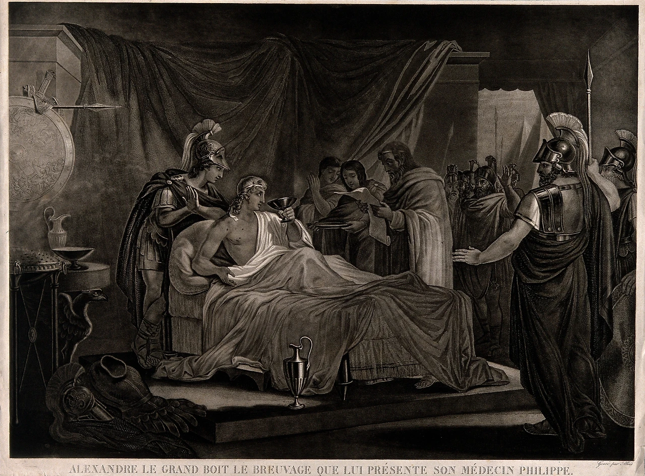 필리포스는 침대에 누워 있는 왕을 진찰한 다음 그 자리에서 약을 조제했다. 그때 한 병사가 들어와 긴급 소식이라며 파르메니온이 보낸 편지를 알렉산드로스에게 전했다. 편지에는 페르시아의 황제 다리우스가 알렉산드로스를 독살하기 위해 주치의인 필리포스를 매수하는 데 성공했다는 소문이 돈다고 적혀 있었다.