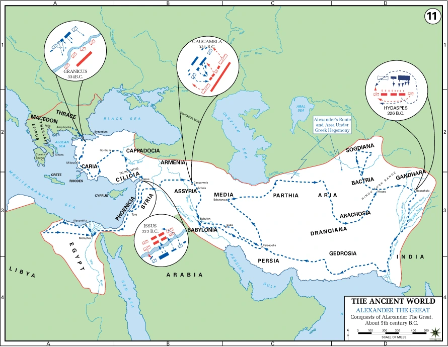 알렉산드로스가 이끄는 그리스 군대는 페르시아 군대의 5분의 1에 불과했다. 4만 명이 조금 넘는 보병과 7,250명의 기병 등 합계 4만 8,000명밖에 되지 않았다. 게다가 전쟁터도 알렉산드로스가 아니라 다리우스가 선택한 곳이었다. 물론 ‘그라니코스전투’나 ‘이소스전투’ 모두 페르시아가 선택한 곳에서 벌어진 전투였다.