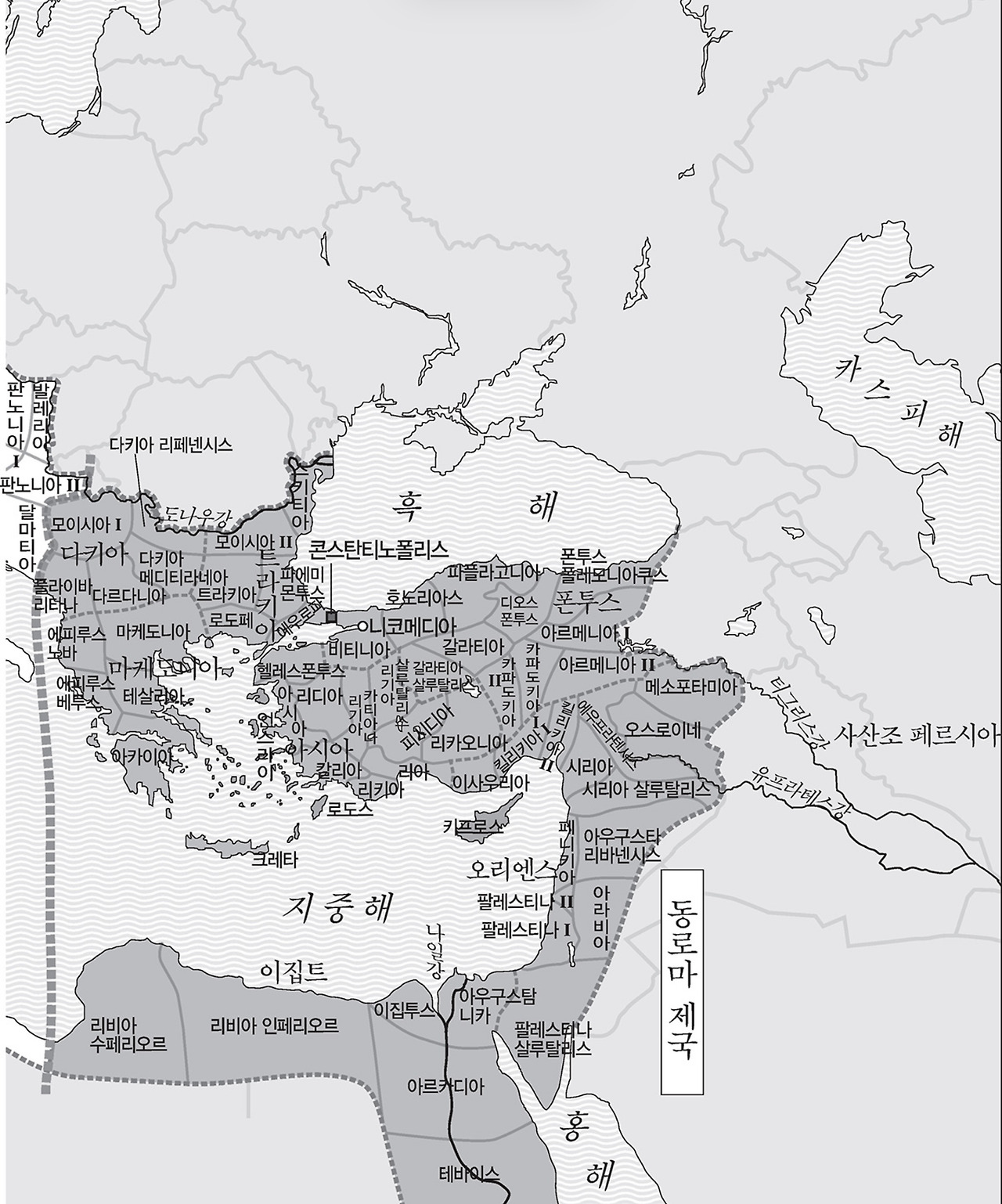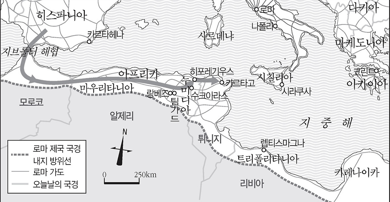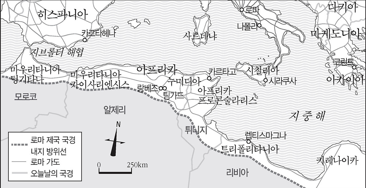 로마인이 ‘아프리카’라고 말하면, 그것은 이집트를 제외한 아프리카 북부를 가리킨다. 키레나이카, 트리폴리타니아, 아프리카 프로콘술라리스, 누미디아, 마우리타니아 카이사리엔시스, 마우리타니아 팅기타나라는 여섯 속주가 동쪽에서 서쪽으로 늘어서 있었다. 오늘날 리비아, 튀니지, 알제리, 모로코의 네 나라에 해당한다.
