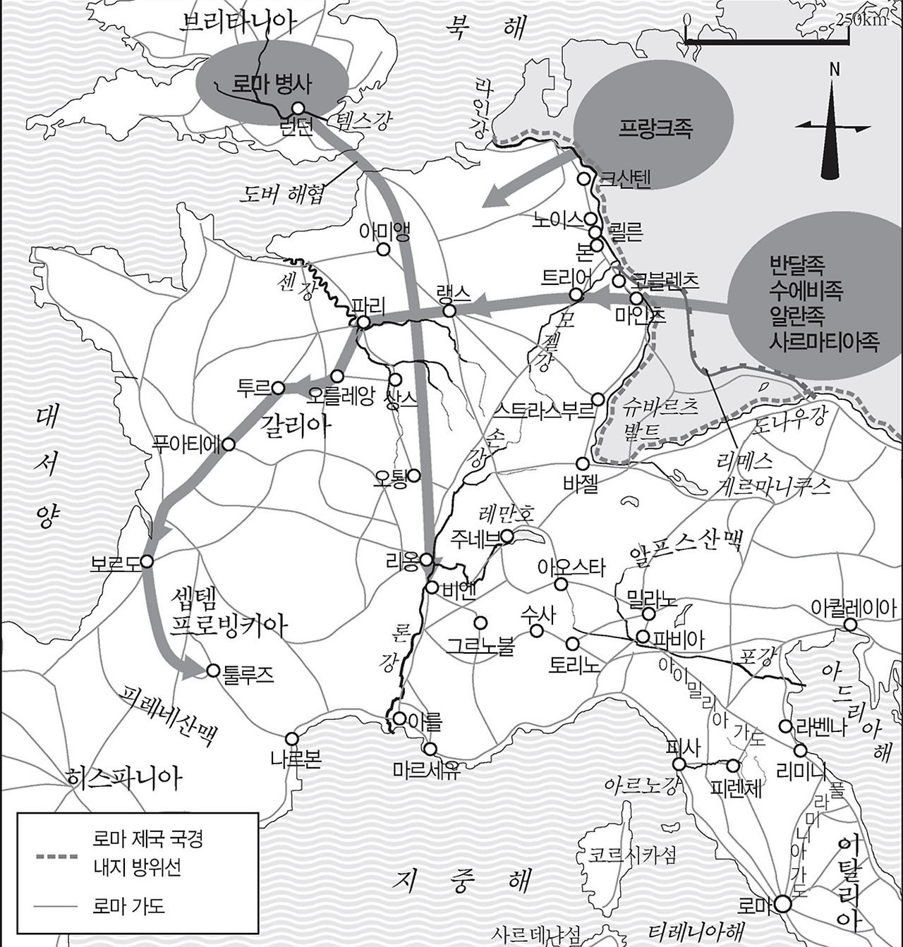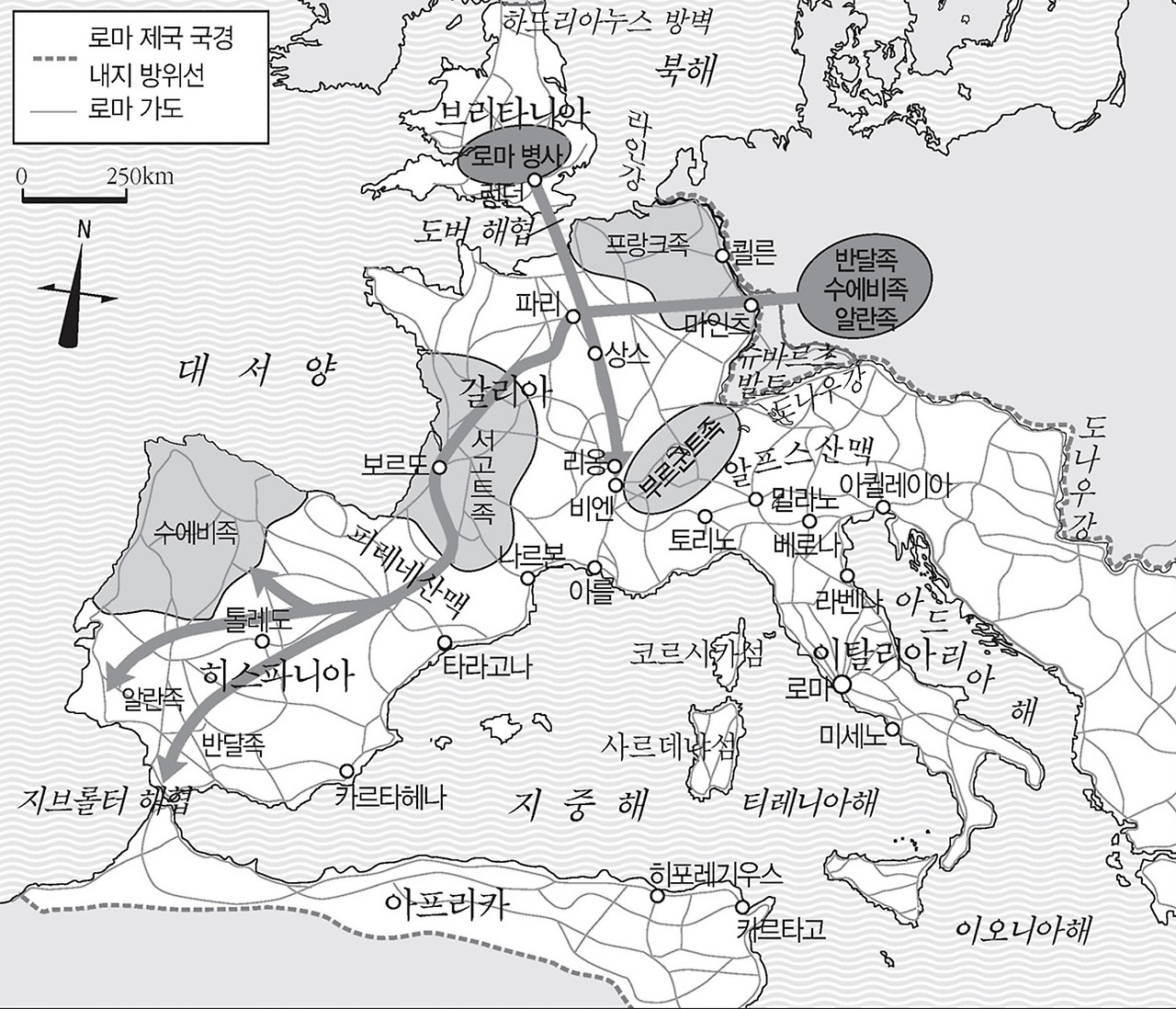 410년경 서로마제국은 이제 더 이상 갈리아지방을 지킬 힘이 없었고 이에 갈리아 북쪽 전역에는 프랑크족이 자리잡았고 라인강 중류에서 쳐들어온 반달족, 수에비족, 알란족은 피레네산맥까지 넘어 히스파니아(오늘날의 에스파냐)에 자리를 잡았다.