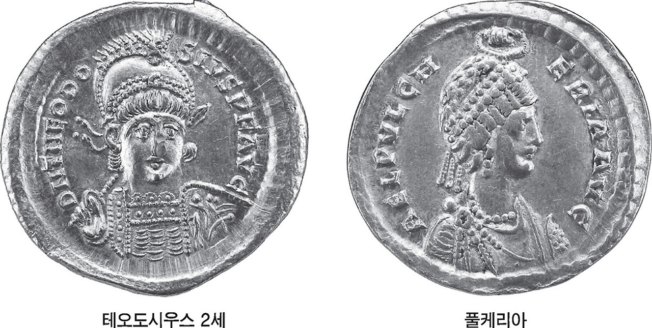 그리고 아르카디우스의 뒤를 이어 제위에 오른 황제는 두 사람 사이에 태어난 테오도시우스 2세다. 이 황제의 치세는 450년까지 42년이나 되지만, 그동안 동로마 제국을 통치한 사람은 황제의 누나 풀케리아였고, 치세 후반에는 테오도시우스 2세의 아내가 여기에 가세한다. 독신이었으며 광신적일 만큼 열성적인 가톨릭 신자였던 풀케리아의 영향으로 콘스탄티노폴리스 황궁의 일상은 기도로 시작하여 기도로 끝난다고 할 정도였다.