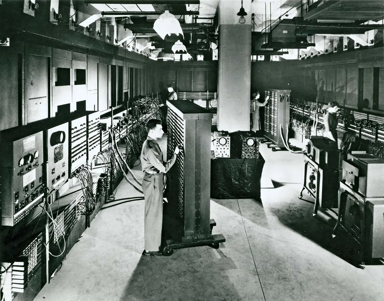 폭 9미터, 길이 17미터짜리 연구실의 벽을 따라가며 설치된 ENIAC은 1만 8,000개의 진공관과 거미줄 같은 전선, 그리고 수많은 스위치가 달린 2.4미터 높이의 계기판으로 이루어져 있었다.