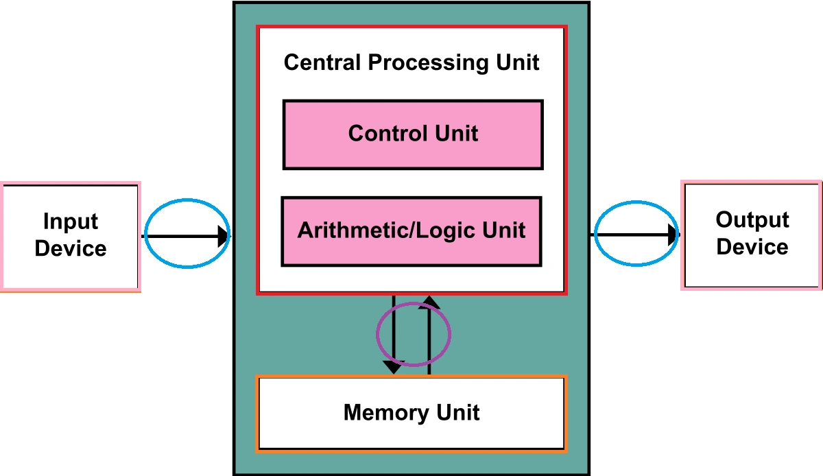 노이만이 서술한 조립법에는 총 5개의 ‘기관organ(부품)’이 등장하는데, 처음 3개는 덧셈이나 곱셈 같은 수학 연산을 수행하는 ‘중앙산술장치(central arithmetic unit)’와 명령이 올바른 순서로 실행되도록 제어하는 ‘중앙제어장치(central control unit)’, 그리고 계산기의 코드와 숫자를 저장하는 ‘메모리(memory)’였다. 나머지 네 번째와 다섯 번째는 계산기의 내부와 외부로 데이터를 전송하는 입력 및 출력 장치이다.