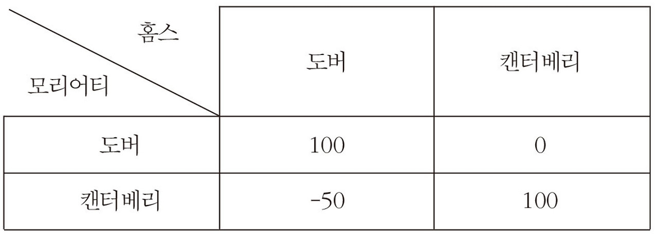 노이만은 모리어티 교수가 도버나 캔터베리에서 홈스를 잡으면 100유틸을 획득하고, 모리어티가 캔터베리에서 내렸는데 홈스가 도버에 도착하여 유럽 대륙으로 탈출하는 데 성공하면 50유틸을 잃는 것으로 설정했다(런던을 서울에, 도버를 부산에 비유하면 캔터베리는 대구쯤 된다).