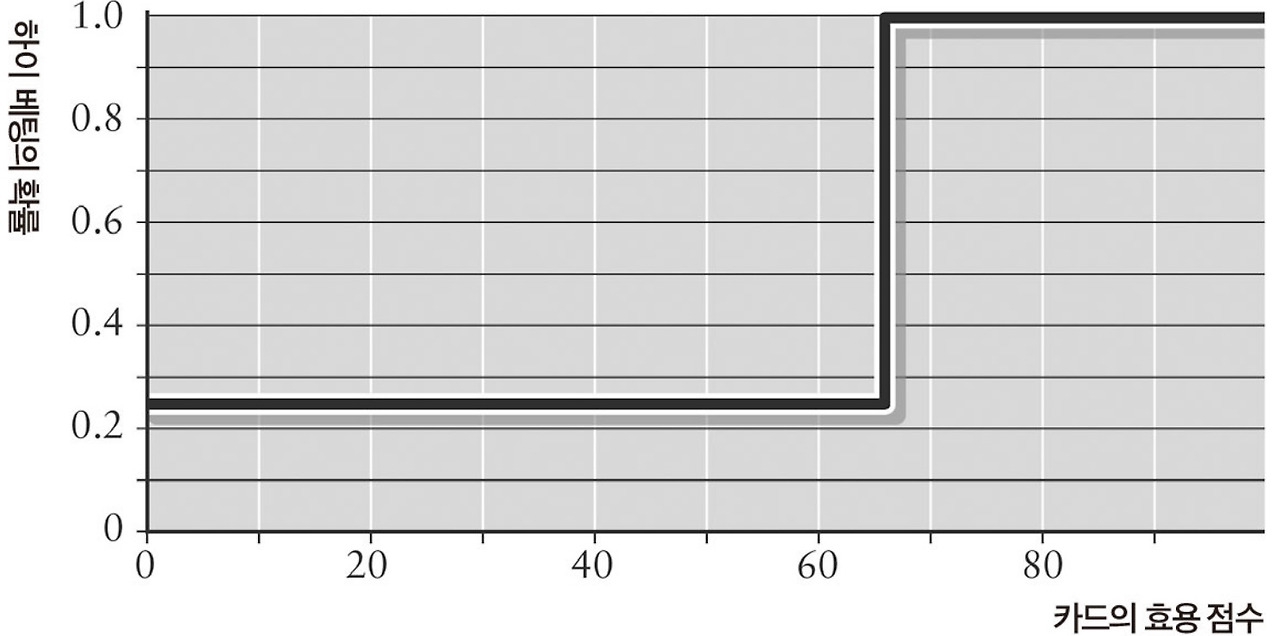 이 경우 노이만은 두 플레이어의 최대최소 전략이 “점수가 높은 카드를 손에 들고 하이 베팅을 하는 것”이라고 했다. 물론 당연한 이야기다. 하이 베팅을 해도 되는 점수의 임계점, 즉 점수의 하한선은 하이와 로에 걸린 돈(H와 L)의 상대적 크기에 따라 결정된다.