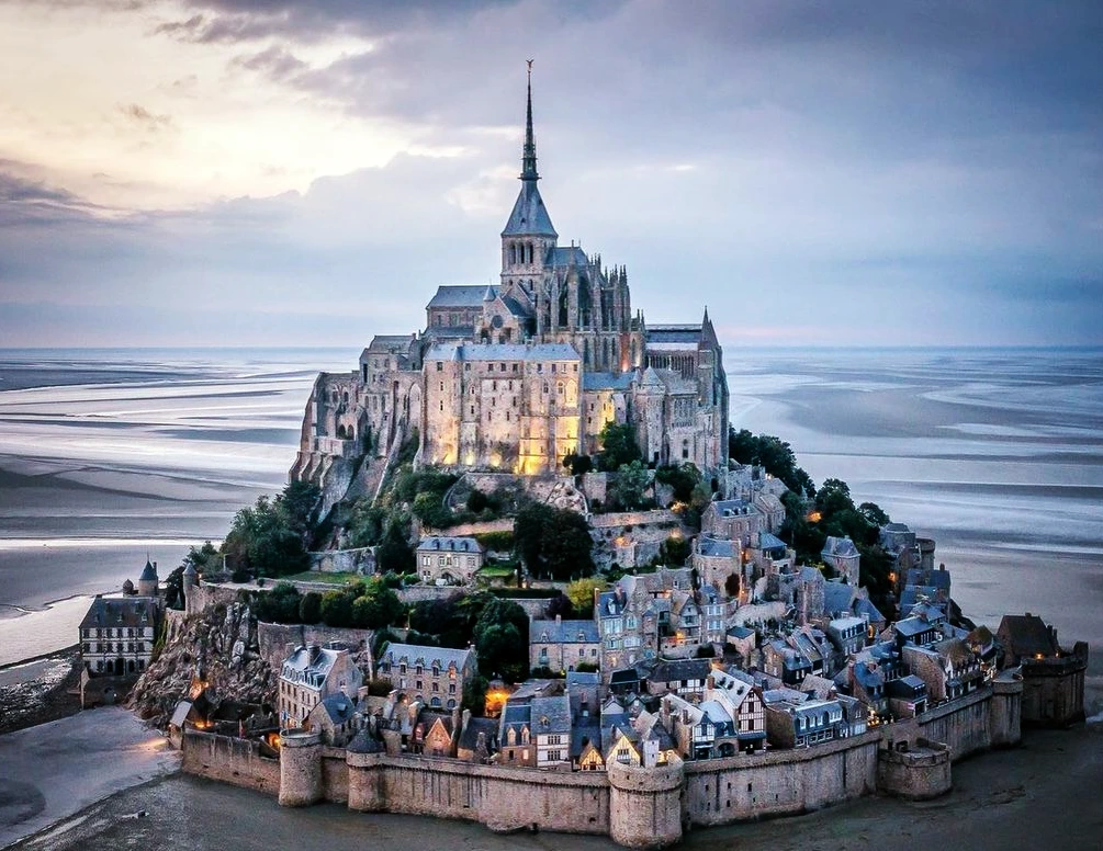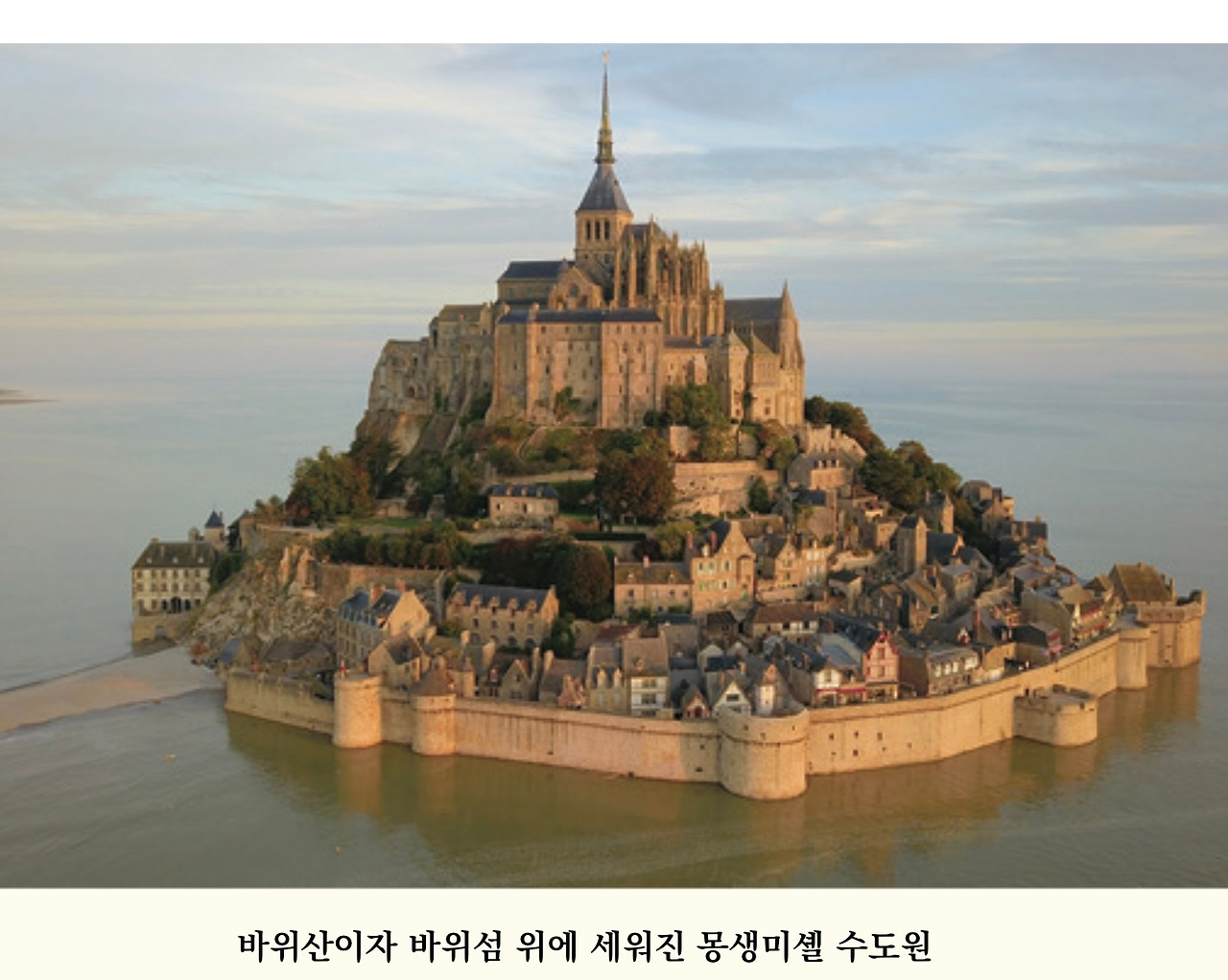 대천사에게 혼풀이 나고서야 일을 시작한 주교는 708년에 작은 수도원을 지었다. 당시 존재했던 대부분의 다른 수도원들은 바이킹의 공격을 받아 파괴되었고, 몽생미셸만 거의 유일하게 살아남았다, 썰물 때는 육지와 연결된 바위산이었 다가 밀물 때는 섬으로 변하는 외진 곳에 지어진 이 수도원은 곧 유명한 순례지가 되었다.