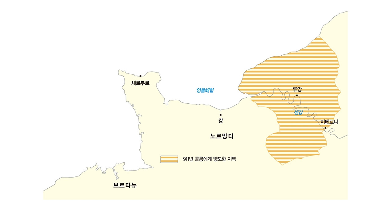 프랑스 국왕 샤를 3세는 롤롱 집단과 협상을 벌여서 911년에 생클레르쉬르엡트(Saint-Clair-sur-Epte) 조약을 맺었다. 계약 내용은 롤롱이 엡트Epte강(파리 서쪽 지베르니 부근에서 센강으로 흘러 들어가는 지류)에서부터 해안까지의 지역을 영토로 받는 대신 프랑스 왕의 신하가 되어 왕국의 방어를 돕는다는 것이었다.