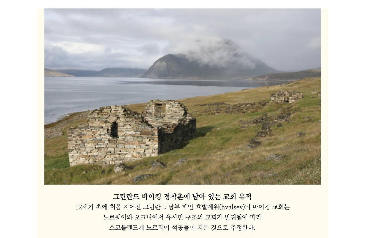 그린란드 바이킹 정착촌에 남아 있는 교회 유적 12세기 초에 처음 지어진 그린란드 남부 해안 흐발세위(hvalsey)의 바이킹 교 회는 노르웨이와 오크니에서 유사한 구조의 교회가 발견됨에 따라 스코틀랜드계 노르웨이 석공들이 지은 것으로 추정한다.