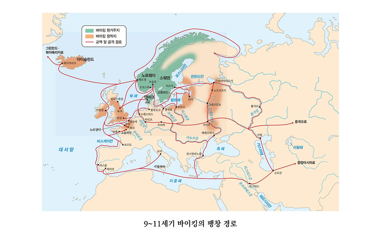 8세기 중반부터 11세기 중반까지 약 300년에 이르는 소위 ‘바이킹의 시대’에, 이들의 팽창은 크게 세 방향으로 진행되었다. 남서쪽으로는 영국, 프랑스 해안을 침략하다가 시간이 갈수록 그 범위를 넓혀 지중해까지 이르렀다. 북서쪽으로는 아이슬란드, 그린란드를 거쳐 아메리카대륙에 상륙하여 한때 그곳에 식민지를 건설한 적도 있다(콜럼버스보다 500년 정도 앞선다). 남동쪽으로는 러시아를 넘어 비잔티움제국에 이르렀고, 어쩌면 아라비아, 심지어 인도와 중국까지 도달했을 가능성을 거론하는 학자도 있다.