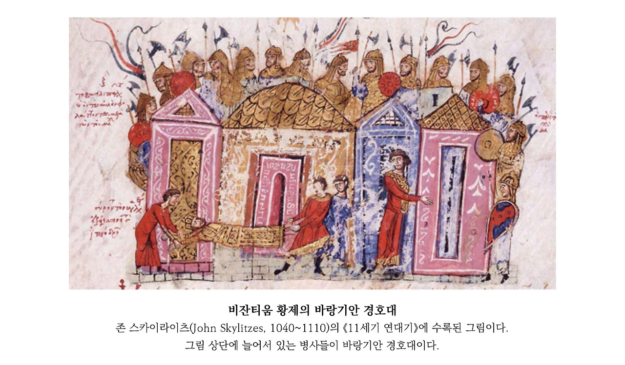 바이킹은 러시아 땅에 머물지 않고 더 남쪽으로 내려가서 비잔티움제국에까지 들어갔다. 바랑고이 지배자 올레그(Oleg)가 큰 무리를 이끌고 침입하여 콘스탄티노플 근처를 황폐화하자, 황제 레오 6세(재위 886~912)가 그들에게 은화 100만 개(!)를 주며 엄청난 음주, 살벌한 전투용 도끼 등으로 유명한 이 가공할 전사들을 차라리 ‘바랑기안 경호대(Varangian guard)’로 고용한 것이 ‘신의 한 수’였다. 이 황제 경호대는 비잔티움제국을 위해 여러 차례 중요한 전투에 나서 혁혁한 공을 세웠다.