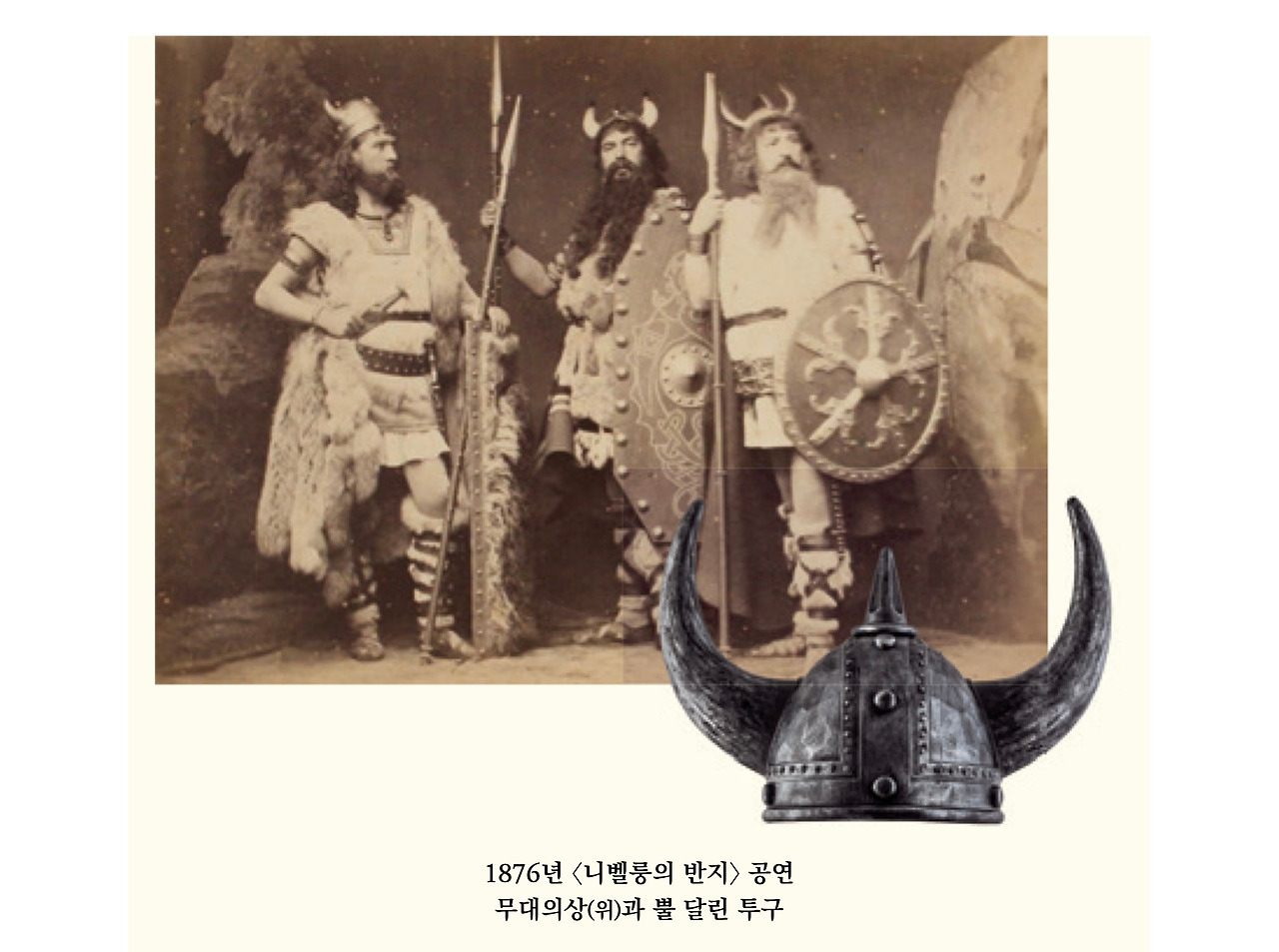 1876년 독일 바이로이트 축제에서 <니벨룽의 반지>를 공연할 때 무대와 의상 디자인을 맡은 화가 되플러Carl Emil Doepler는 일부 캐릭터들에게 뻘 달린 금속 투구를 쓰게 했다. 이후 이 투구는 바이킹의 상징처럼 되었지만, 사실은 역사적 근거가 전혀 없다. 뿔 달린 투구를 사용한 것은 오히려 프랑스인의 조상 격인 골족 사람들이고, 정 작 바이킹은 깃털 달린 투구를 사용했다. 그나마도 이 투구들은 많이 발굴되지 않는데, 금속이 아니라 가죽으로 만들어서 장기간 보존되지 않기 때문이다.