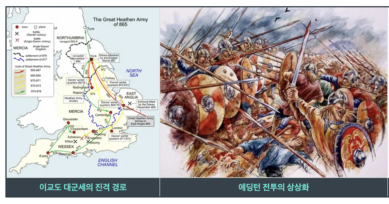 그러던 중 전설적인 바이킹이었던 라그나르 로드브로크가 노섬브리아에서 비참하게 죽음을 당하면서 이에 격분한 그의 아들들이 대규모로 브리튼 섬을 침공했던 것이다. 라그나르의 아들 '이바르 라그나르손'과 할프단 라그나르손이 이 바이킹들을 이끌었으며 브리튼인들은 이들을 이교도 대군세라고 불렀다. 이전의 바이킹들은 그냥 약탈만 하고 바로 떠난 것과는 달리 이들은 아예 노섬브리아 내륙까지 깊숙이 밀고들어와 노섬브리아의 수도였던 요크를 점령하고 아예 눌러앉아버렸다.
