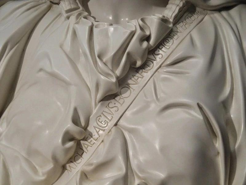 또한 바티칸 피에타는 작품 완성 직후부터 원작자에 대한 논란을 일으켰다. 이처럼 아름다운 작품을 애송이 조각가가 만들었을 리가 없으며 다른 작가의 작품이라는 소문이 돌자, 미켈란젤로는 분개하여 성모의 옷깃 부분에 자기 이름을 새겨 넣었다. 미켈란젤로가 서명을 남긴 유일한 사례인데, 그는 곧 이렇게 한 것을 깊이 후회했다고 한다.