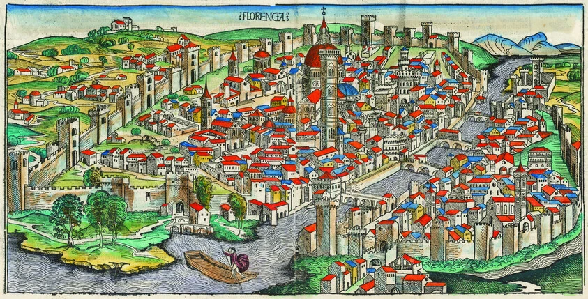 이런 천재들의 활동 무대는 실로 매우 좁은 공간이다. 서쪽의 산타마리아노벨라 교회부터 동쪽의 산타크로체 교회까지 그리고 북쪽의 산마르코 수도원부터 남쪽의 로마나 성문까지 피렌체 구도심은 동서 간 1.5킬로미터, 남북 간 1.5킬로미터에 불과하다.