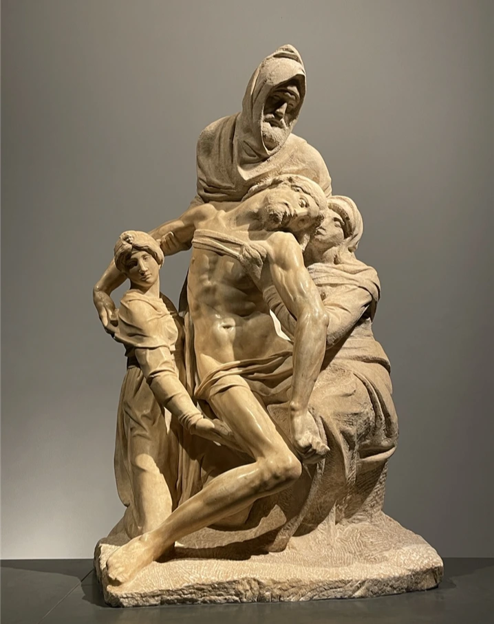 이 세 인물을 마치 품에 안듯이 위에서 굽어보는 니코데모는 미켈란젤로 자신의 얼굴을 하고 있다. 바리새파 지도층 인사였던 니코데모는 밤에 예수를 찾아와서 ‘누구든지 다시 태어나지 않으면 하느님의 나라를 볼 수 없다’는 이야기를 듣는 인물로 성경에 나온다.